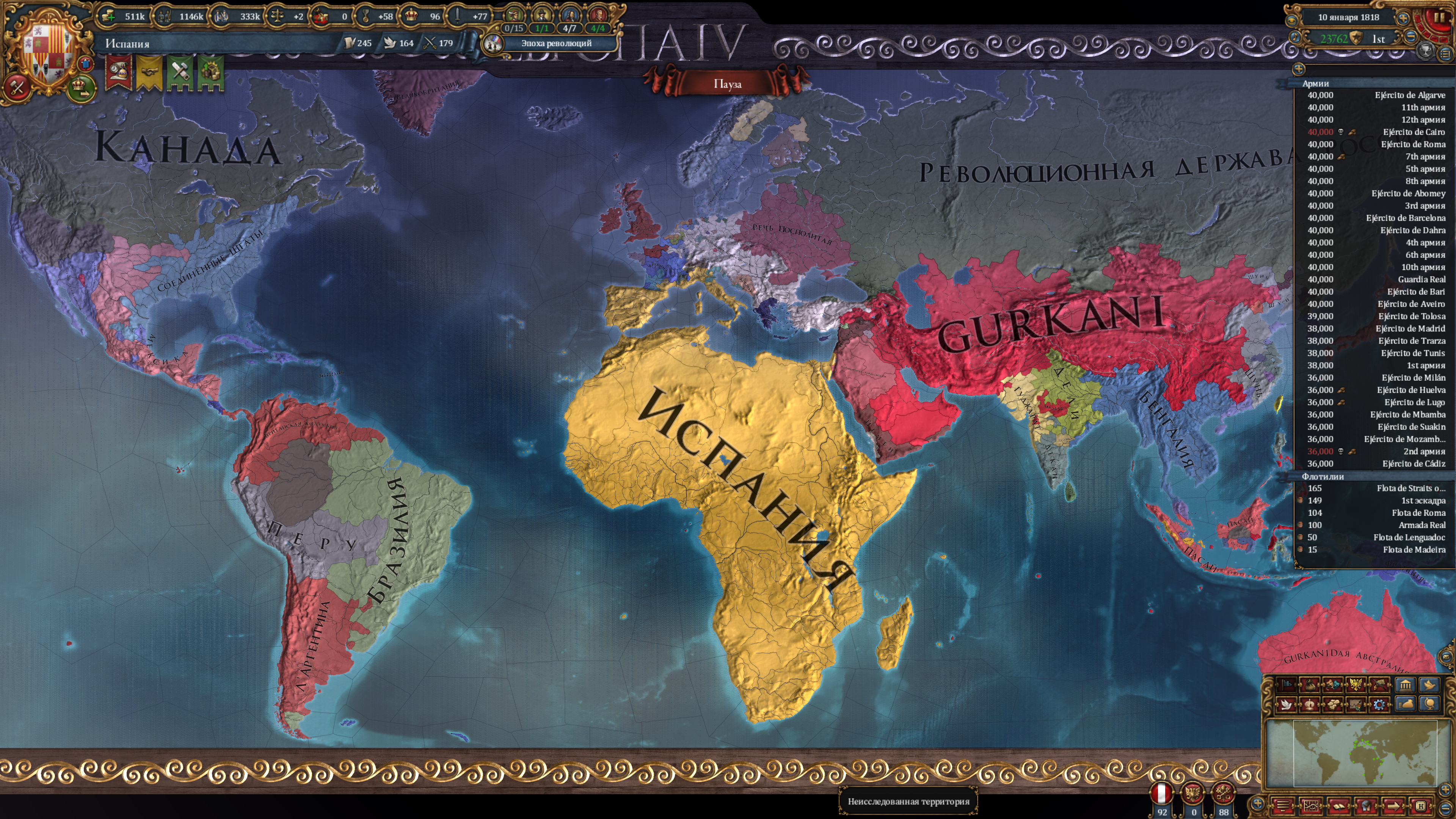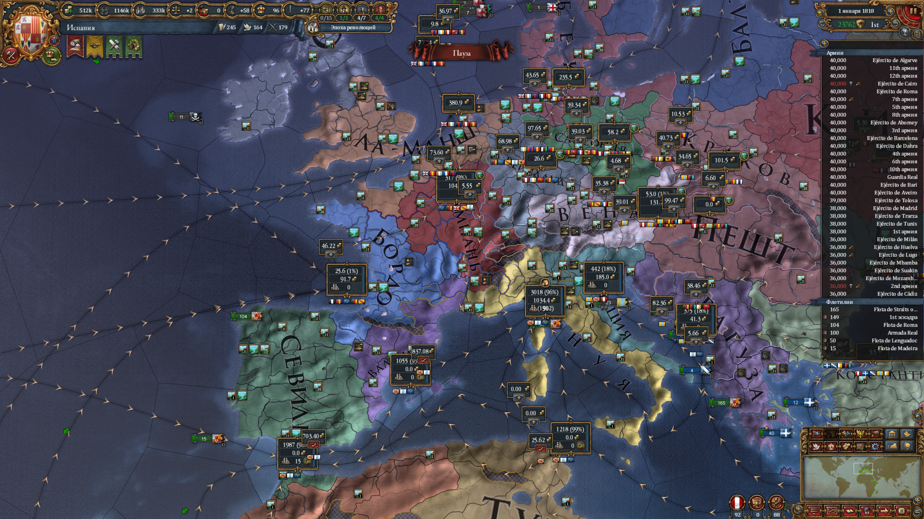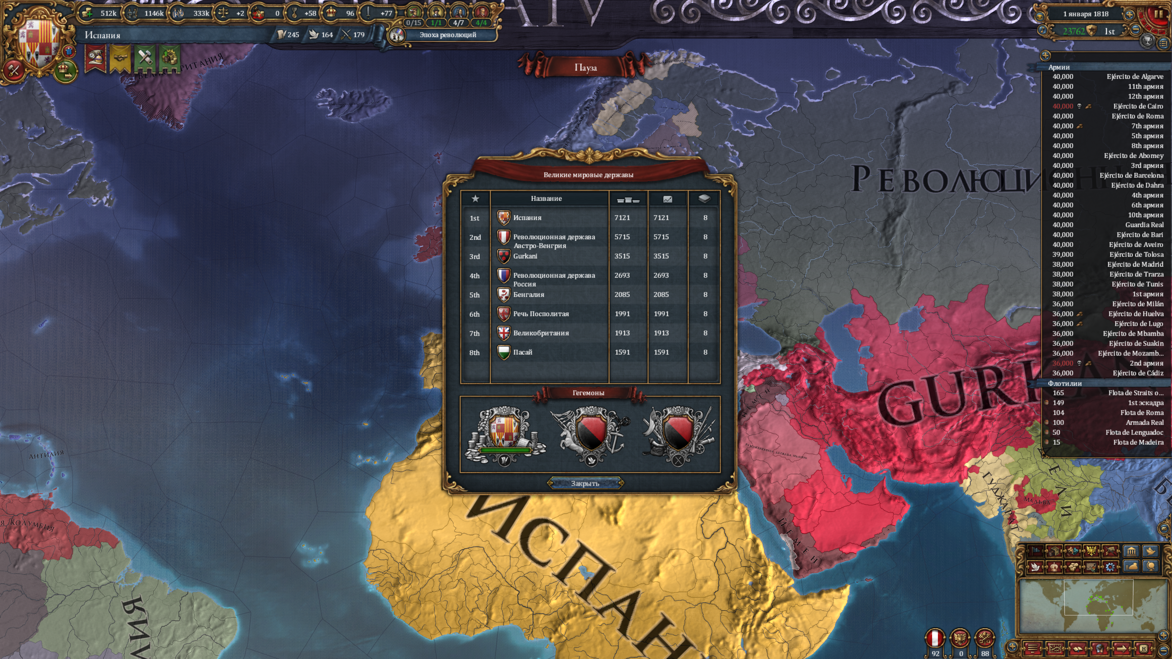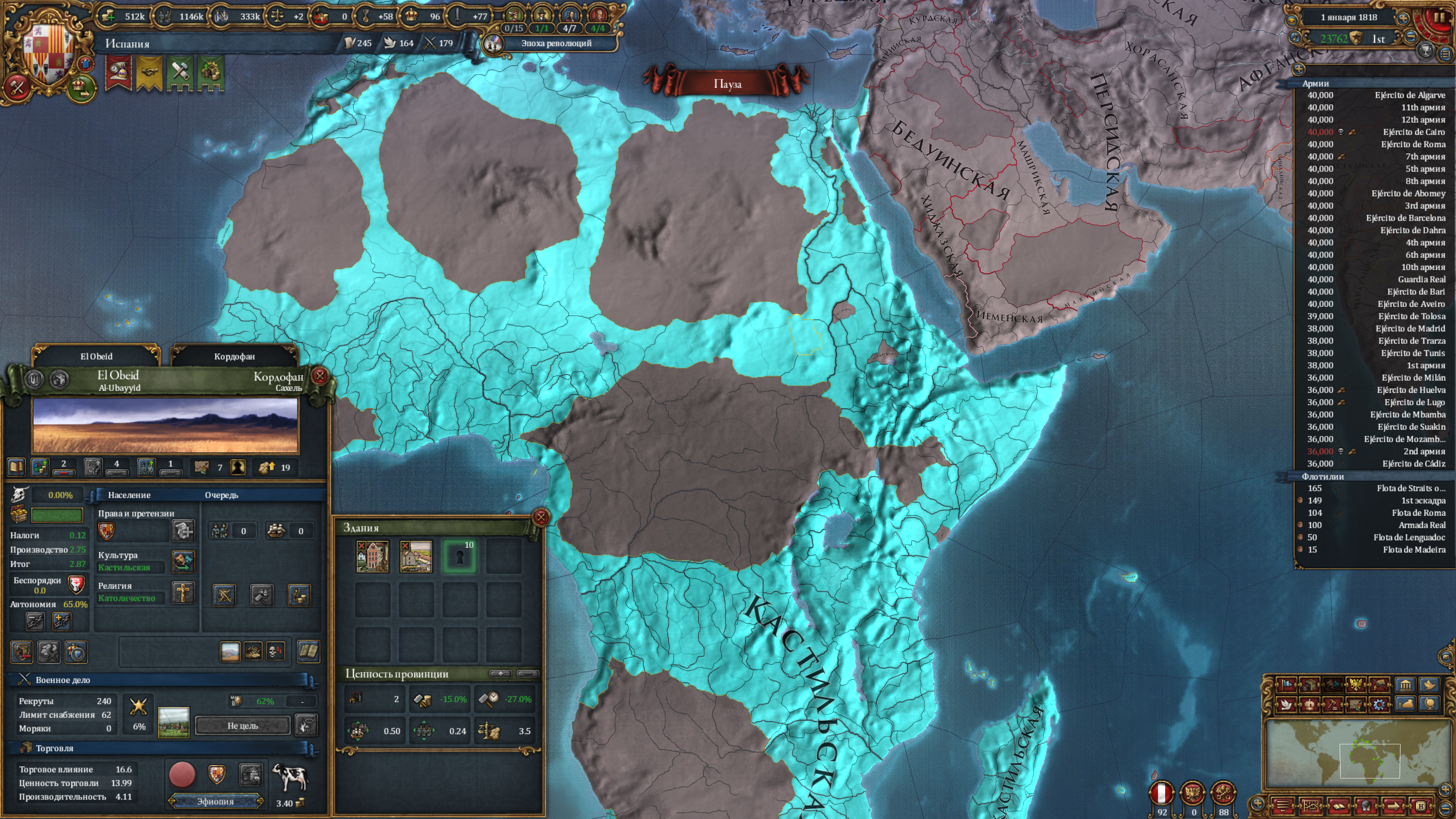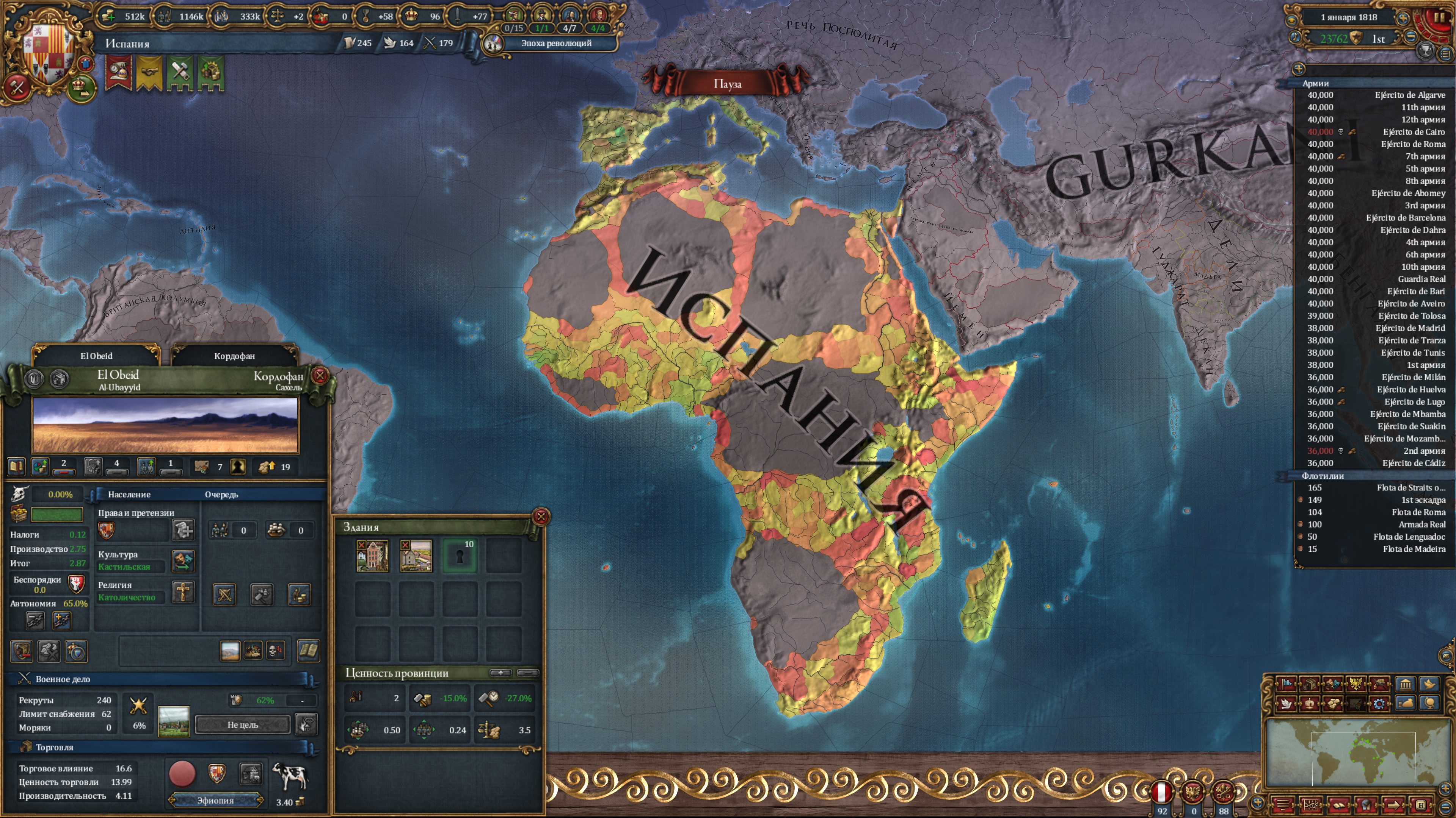 Уже давно закончил партию за Испанию. В целом имеем такой расклад, что я первый в мире (вообще не достижение), но революционный австрияк ебёт меня, в первую очередь качеством армии. Африка вся моя, я тупо крышую всю торговлю идущую в Европу, и при этом сам имею дохуя обрабатываемых дорогих товаров в Африке с хорошим образованием денег в её торговых узлах. Ситуация на геополитической арене такова, что революционная Австрия и Россия держат в страхе всю Гейропу (в том числе меня). В противовес им есть я, с моими западнополушарными союзниками и нишей Польшей, так же привлёк в альян Гуркани. Отдельно весит остров овцеёбов британцев, которым место с нами, но они обиженные жизнью и сидят соло. Если будет война, то это будет разъёб всего континента. Думаю, мой блок должен победить ввиду экономического преимущества, но будет сложно, особенно против Австрии с её крепостями и качественной армией. Да и Россия создаст проблем, в виду наличия миллиона рекрутов.