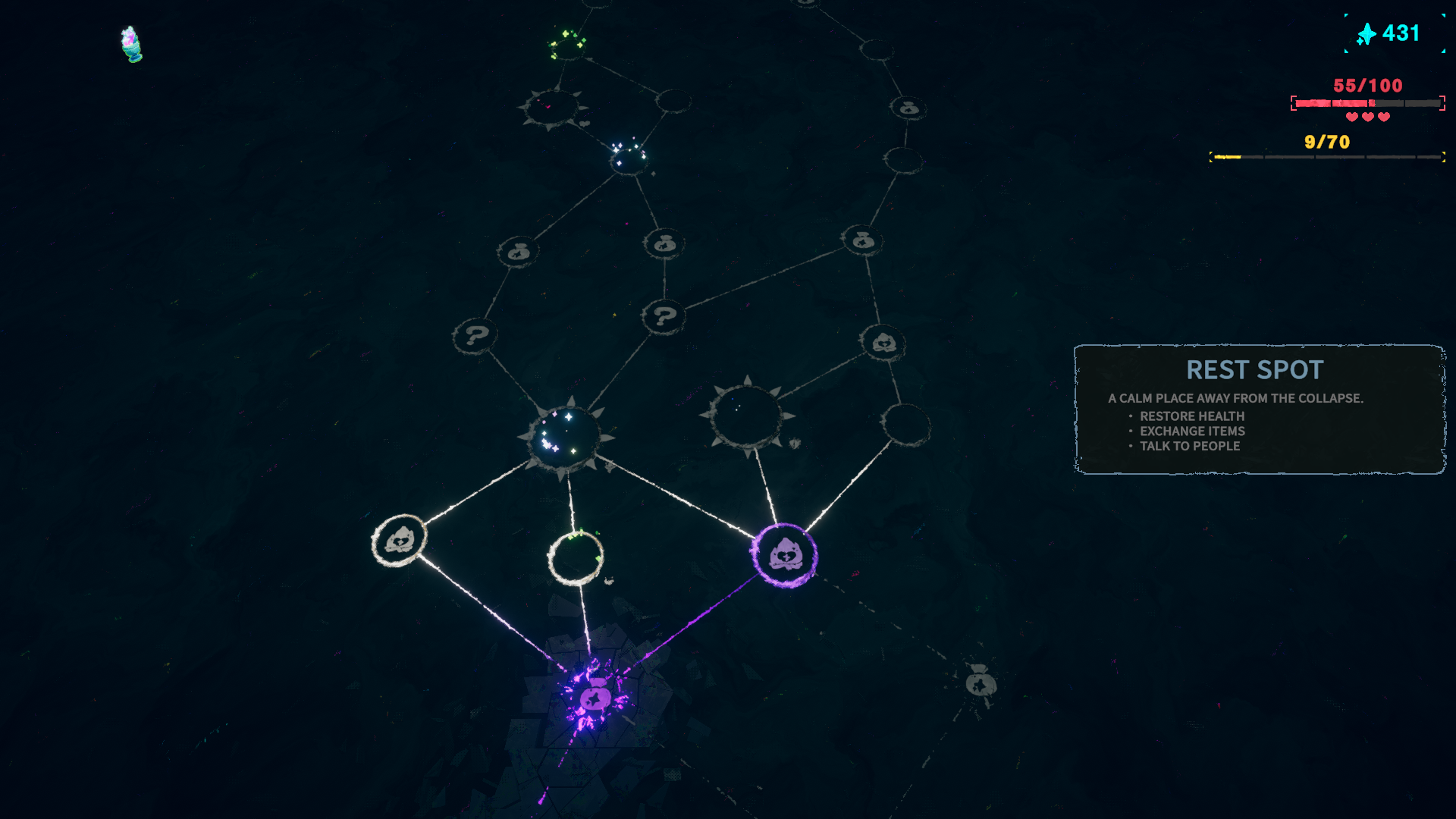 Собственно на этом плюсы заканчиваются и начинают минусы: Во-первых, это РЫГАЛИК. Да-да блядь, рыгалик, причем с картой прямиком из Slay the Spire. 80% игры будешь собирать апгрейды уровня +2% скорости, +5% к восполнению энергии и прочее малозначимое, потому что каждый ран короткий и заканчивается до того, как ты можешь собрать хоть сколько-нибудь значимые апгрейды. Да и большинство предметов не открыто. И только лишь на последних уровнях, за счет того что они на порядок длиннее + ты открыл часть предметов, уже можно говорить о какой-никакой рыгалик-составляющей, за счет которой можно существенно понизить сложность.