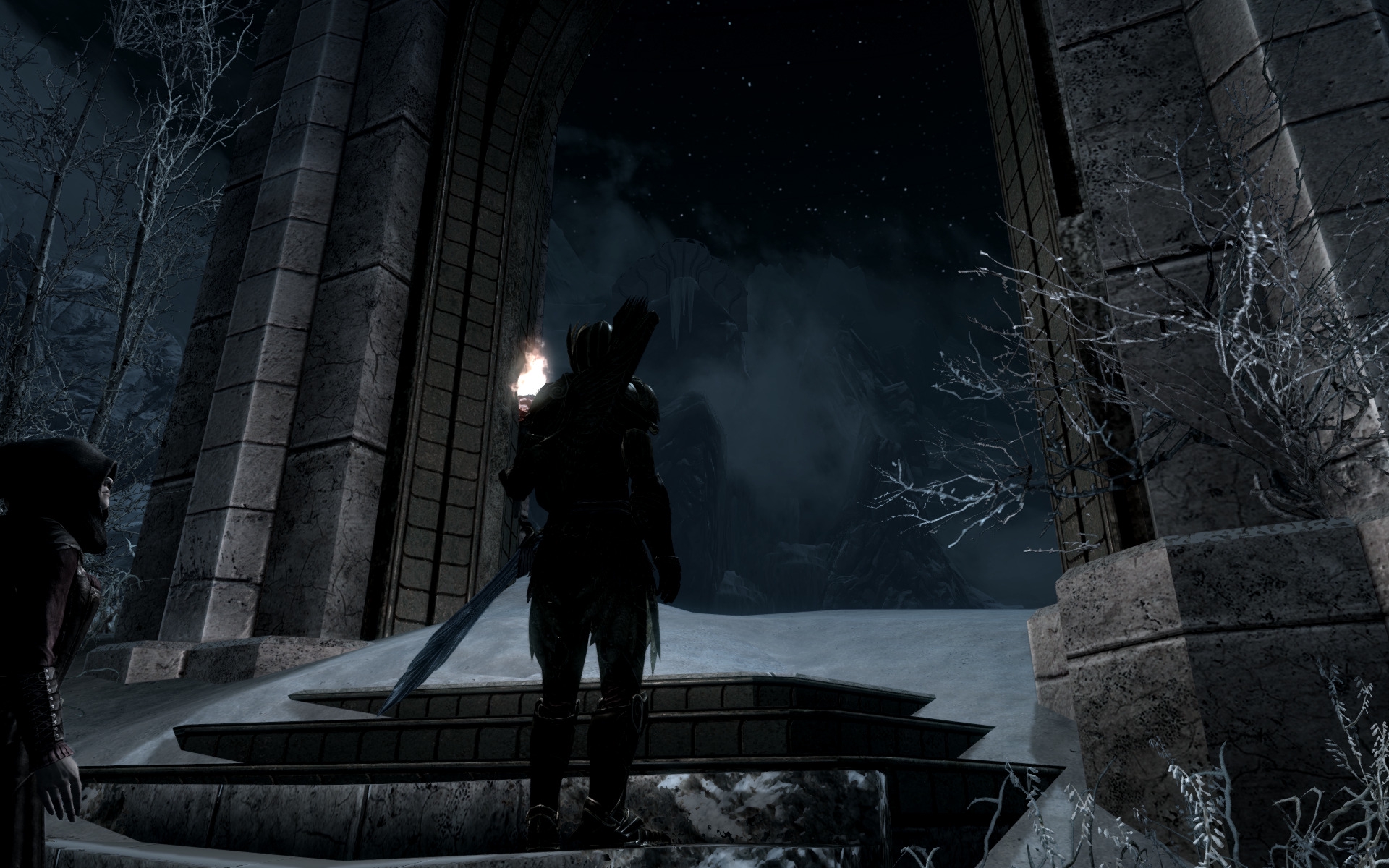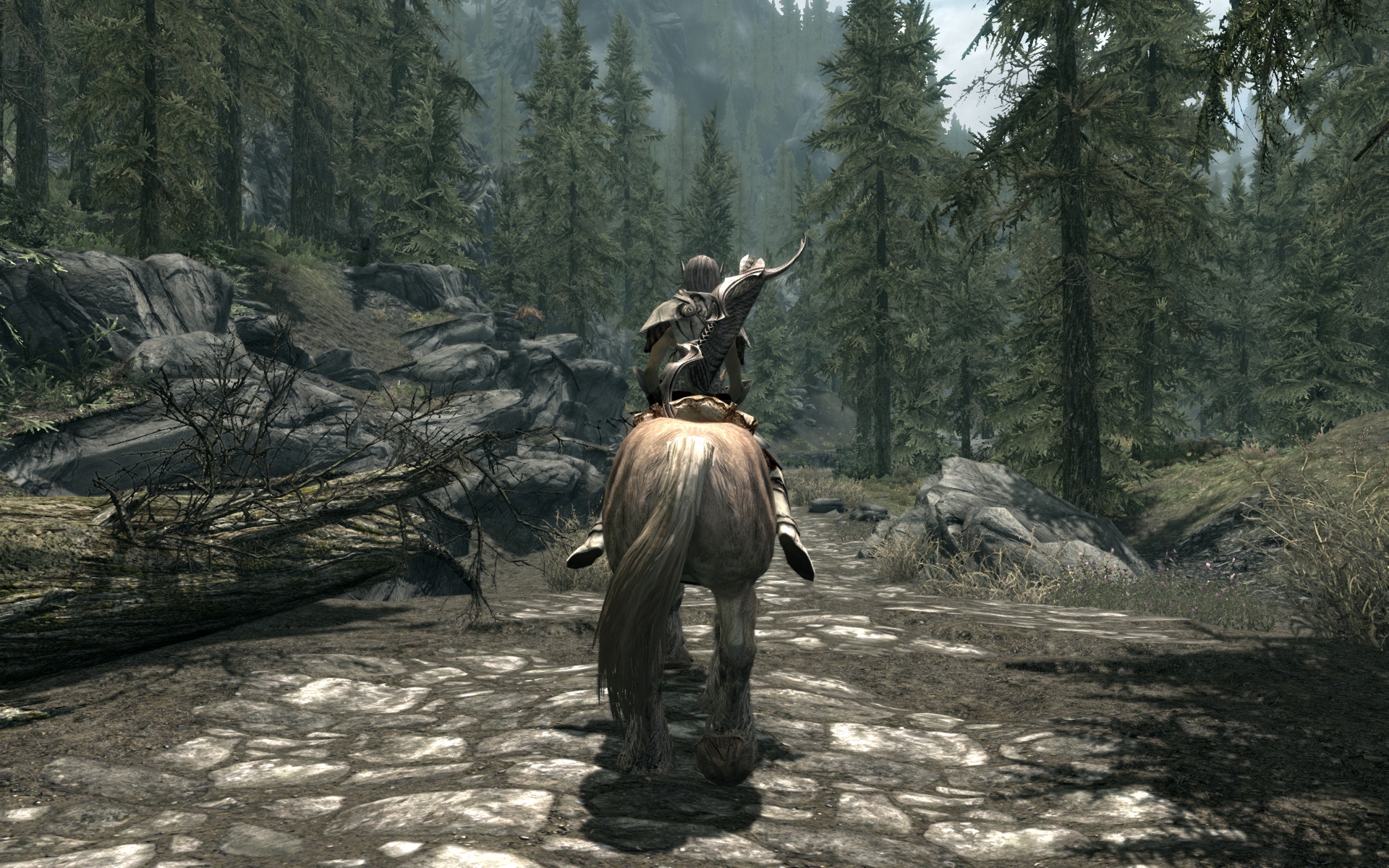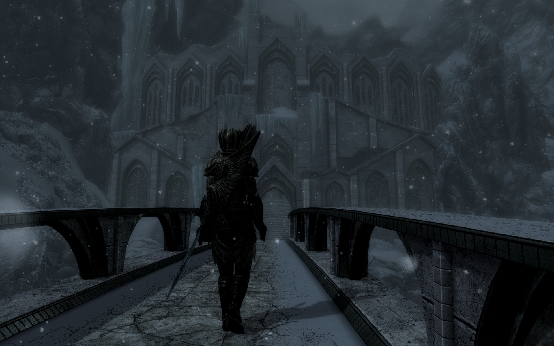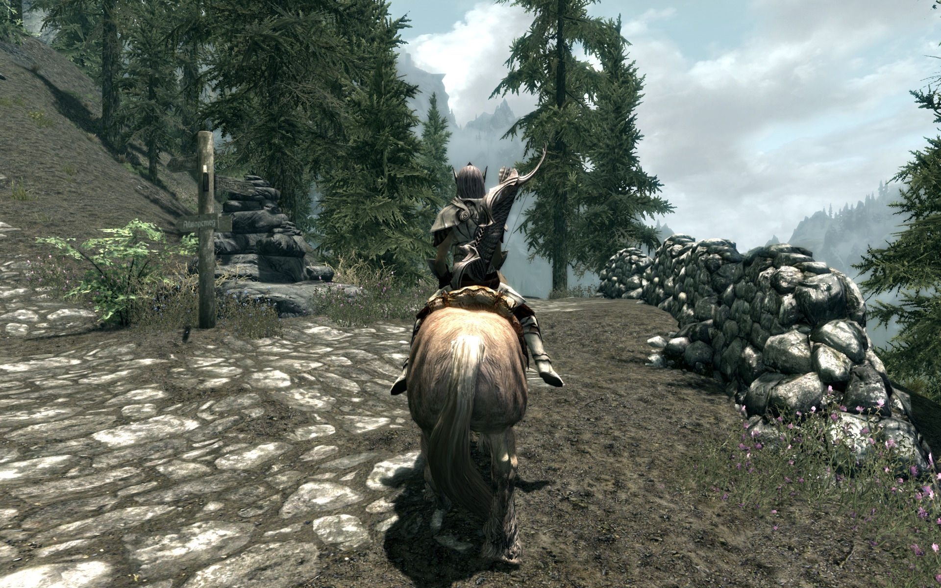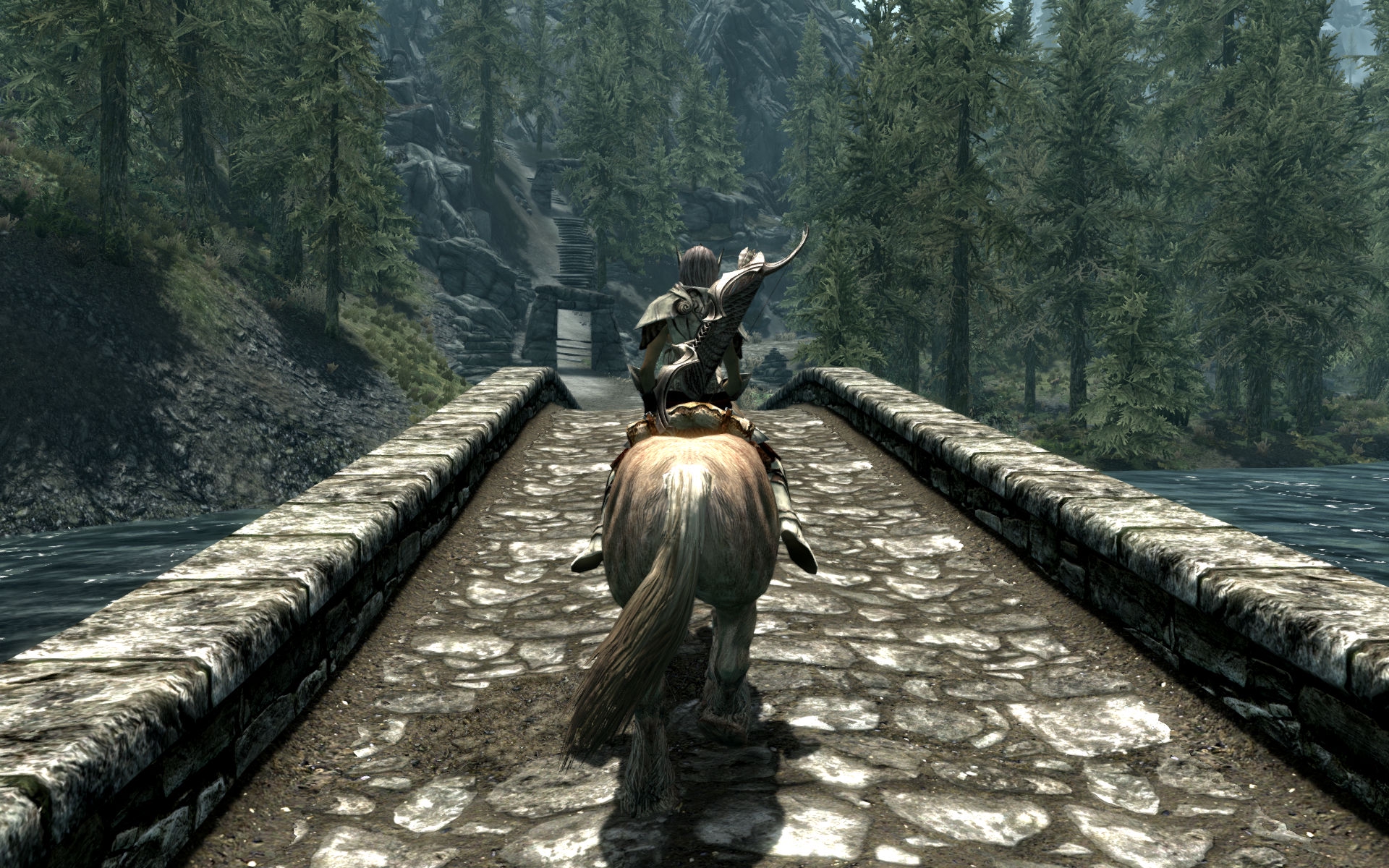 Решил теперь по квестам на лошади кататься, посмотрим насколько быстро надоест. Поездка выдалась долгой - от форта Стражи Рассвета до Замка Волкихар, разные концы карты. Всё-таки этим лучше заниматься, обмазавшись модами - на графон, на погоду, на освещение, ну и плюсом - на поездки с извозчиками. В ваниле поездка норм, но не РДР2, конечно. Ну и по пути на каждом ёбаном повороте тебя ждут волки, саблезубы, ебаные орущие разрывающие уши медведи. За этим мостом меня ждал вор в стеклянной броне и ассассин ТБ, с запиской от давно почившей Астрид. Походу он так долго меня искал, что потерялся на несколько месяцев в глуши и пропустил момент, когда я вступил в ТБ и стал его главой, а Астрид мертва и убежище в Фолкрите уничтожено.