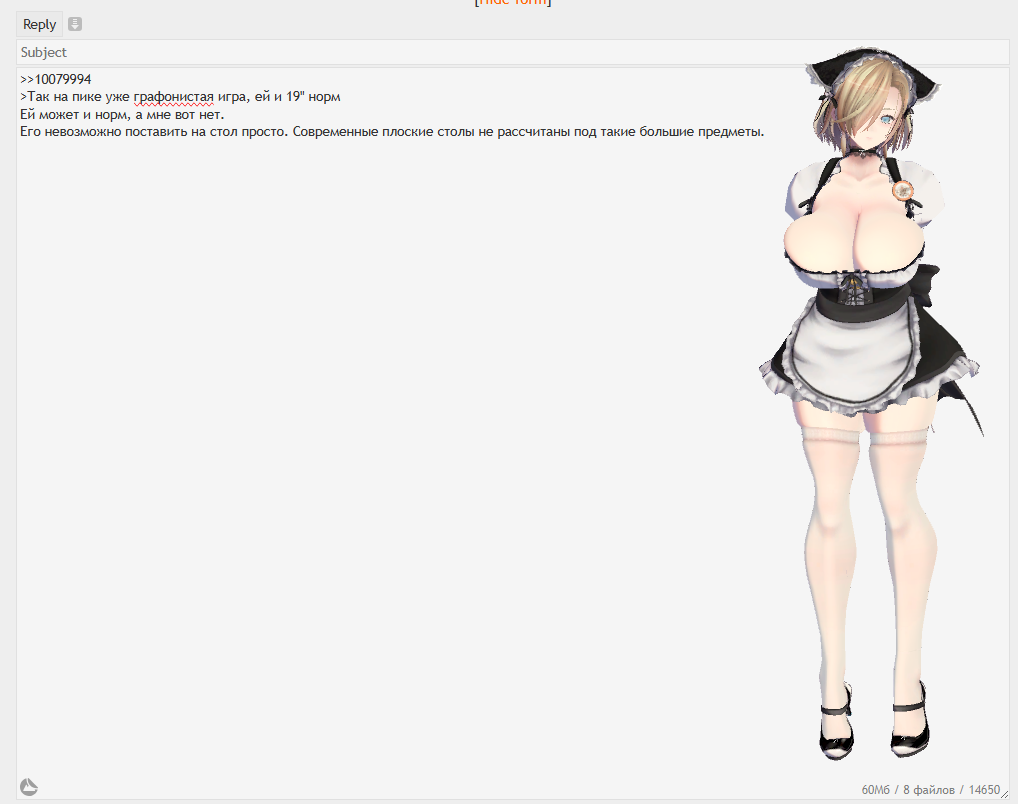>>10079994 >Так на пике уже графонистая игра, ей и 19" норм Ей может и норм, а мне вот нет. Его невозможно поставить на стол просто. Современные плоские столы не рассчитаны под такие большие предметы.