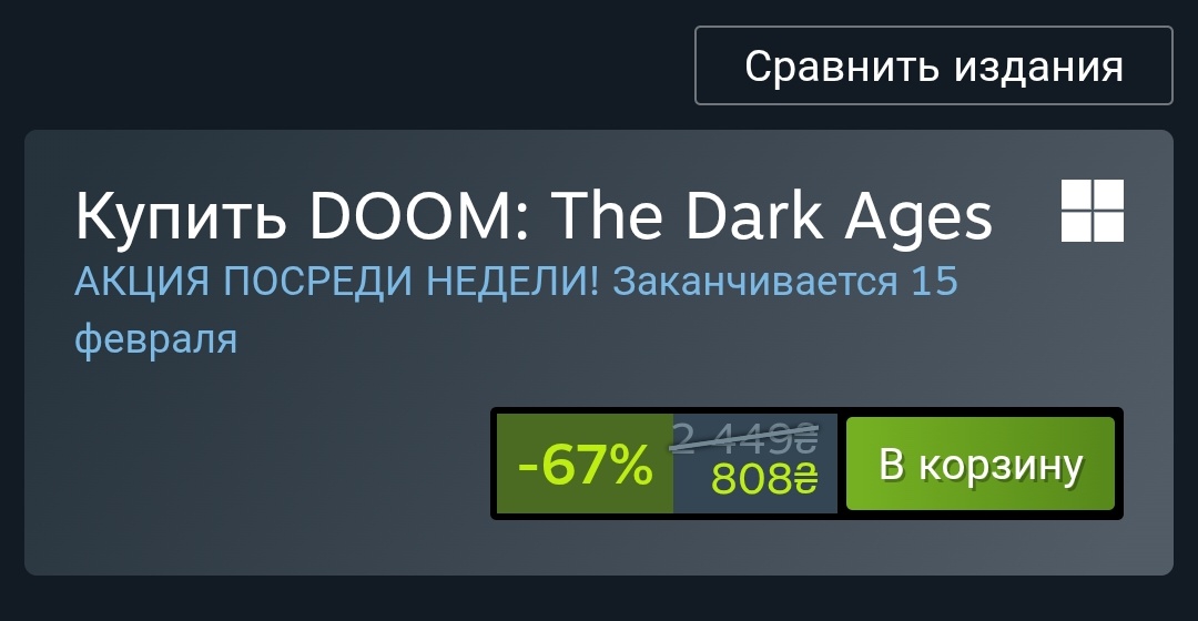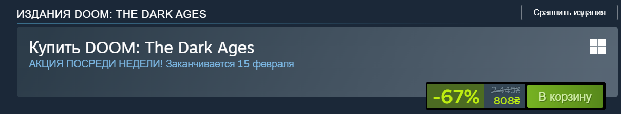 Вы просто вдумайтесь, какой же никому нахуй ненужной парашей оказался новый дум, если с момента релиза игры и года не прошло а ее толкают по 67% скидке, походу скоро либо id software закроют, либо Doom окончательно как серия quake уйдет в прошлое