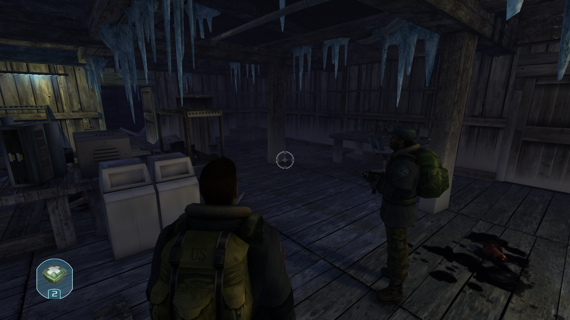 Чуть дальше лабораторного отсека мы наткнулись на разбитый вертолет. Судя по всему тот, что присылал припасы на эту базу. При каких обстоятельствах был сбит неизвестно. Рядом с ним нетронутые C4 боезапасы. Вдоль от вертолёта в разрушенном из домов находился второй найденный мертвый человек. Судя по всему замерз насмерть. Был отдан приказ сверху использовать найденные C4, чтоб заминировать остатки базы. Выдвигаемся.