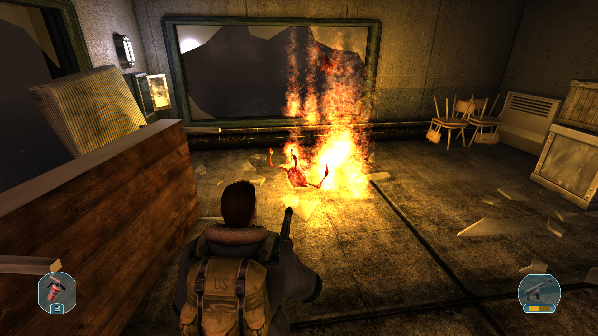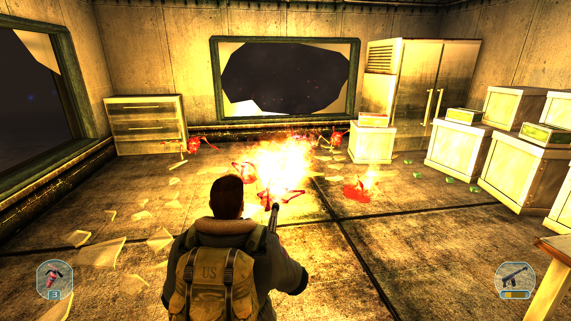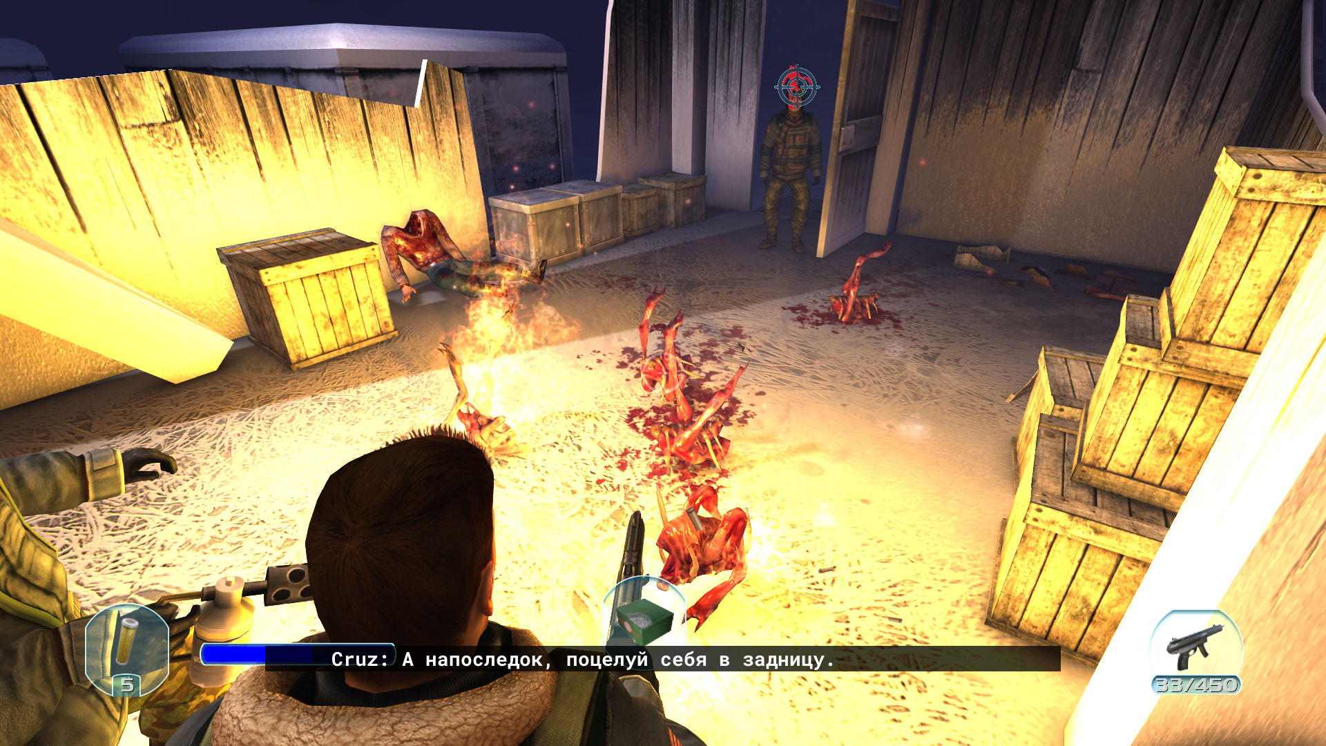 Я и мои напарники засели в здании. Тут тепло и есть боезапасы. Внутри я увидел впервые коконы этих тварей, этот организм плодится как насекомые. Впрочем убив очистив здание не избавило нас от проблем. Теперь они набигают со всех щелей из улицы и прыгают в окна. Ну ничего огнемёт хорошенько поджаривает эту мразь. Их очень много, откуда они взялись? Продолжаю операцию.
