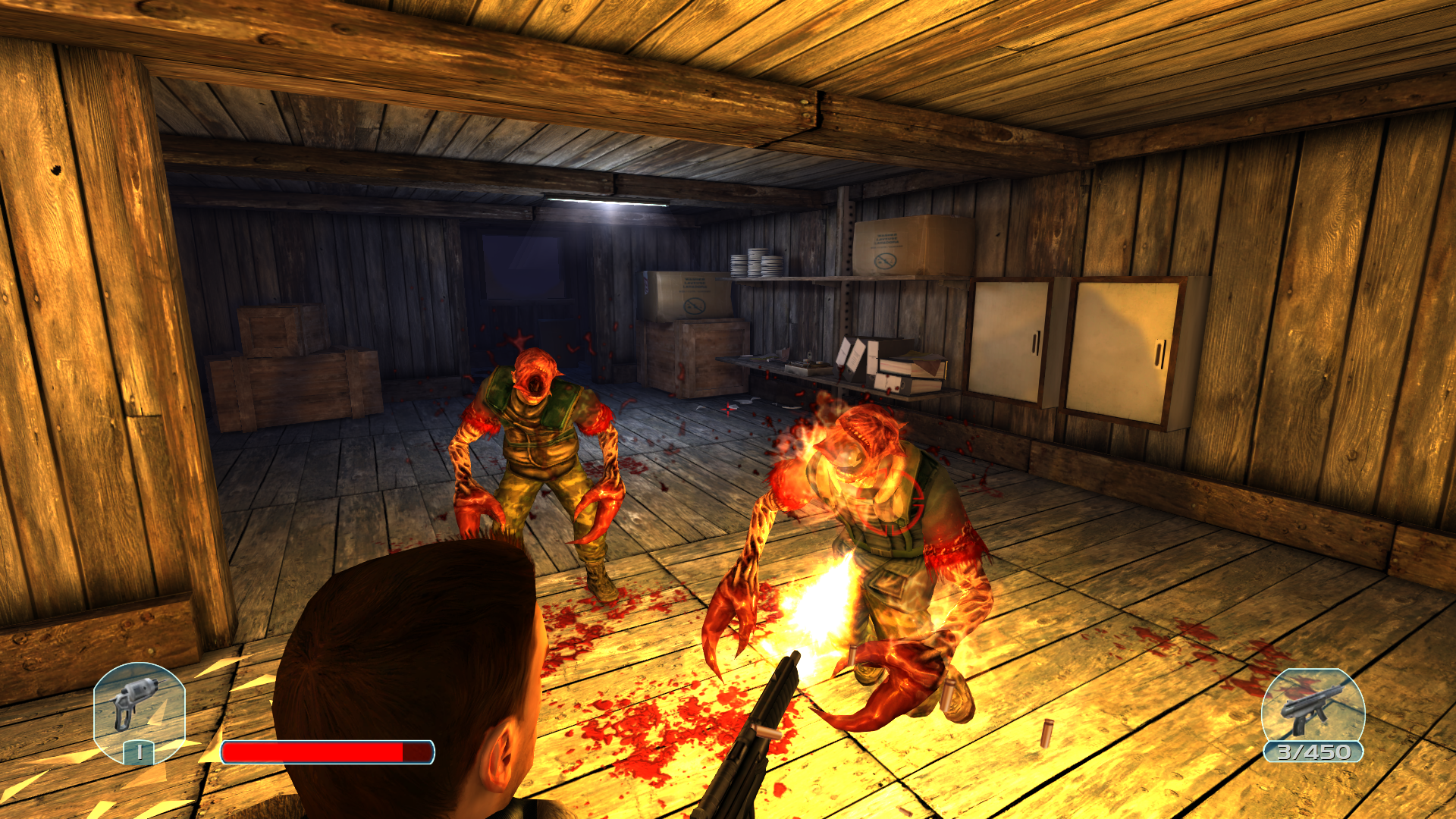 Начал ебашить огнеметом. Их там оказалось несколько. Слишком узкое пространство. Я решил принять рисковое решение и выстрелить по бочкам бензиновым, волной удара меня нахуй выкинуло с дверью наружу, а нечисть сгорела заживо внутри. Чудом уцелел.