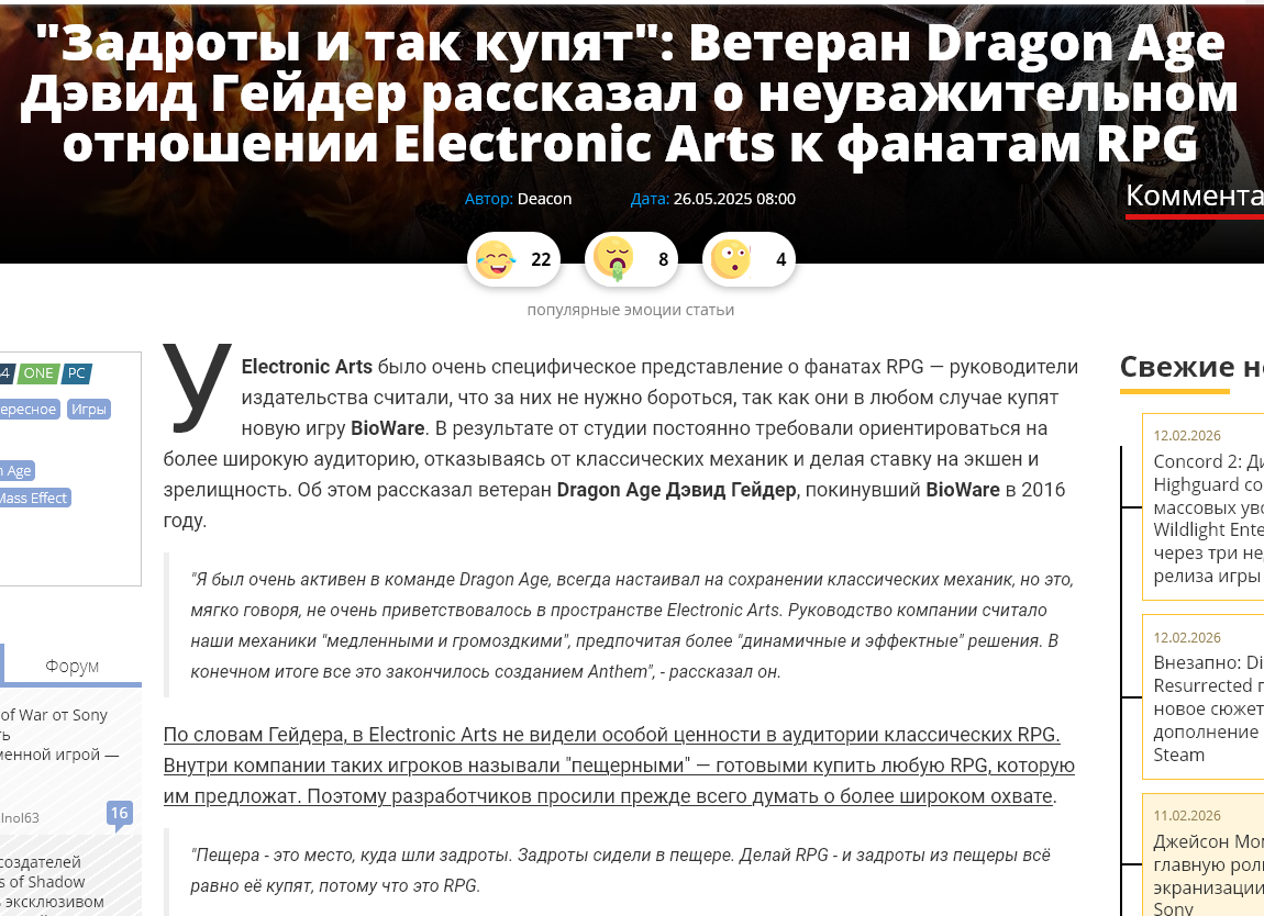 А вы заметили что любая франшиза где компания дропнула поддержку ру-коммьюнити резко обсирается? >Вов, диабла, близы в целом - дропнули русервера послали рукоммьюнити нахуй вов скатился в помойку с микротранзакциями от которой все кроме дегенератов плюются. Диабла 4 никому не интересна. Близов преследует скандал за скандалом. >батлфилд - ЕА не добавили русский язык в игру батлфилд сдох нахуй главпродюссер уебался об скалу >колда - даже не купить никак в РФ не ссыт на колду в 2026г только ленивый >сралкер 2 - все и так понятно анрилокал, который даже пофиксить спустя год с лишним не могут чтобы он не вылетал
