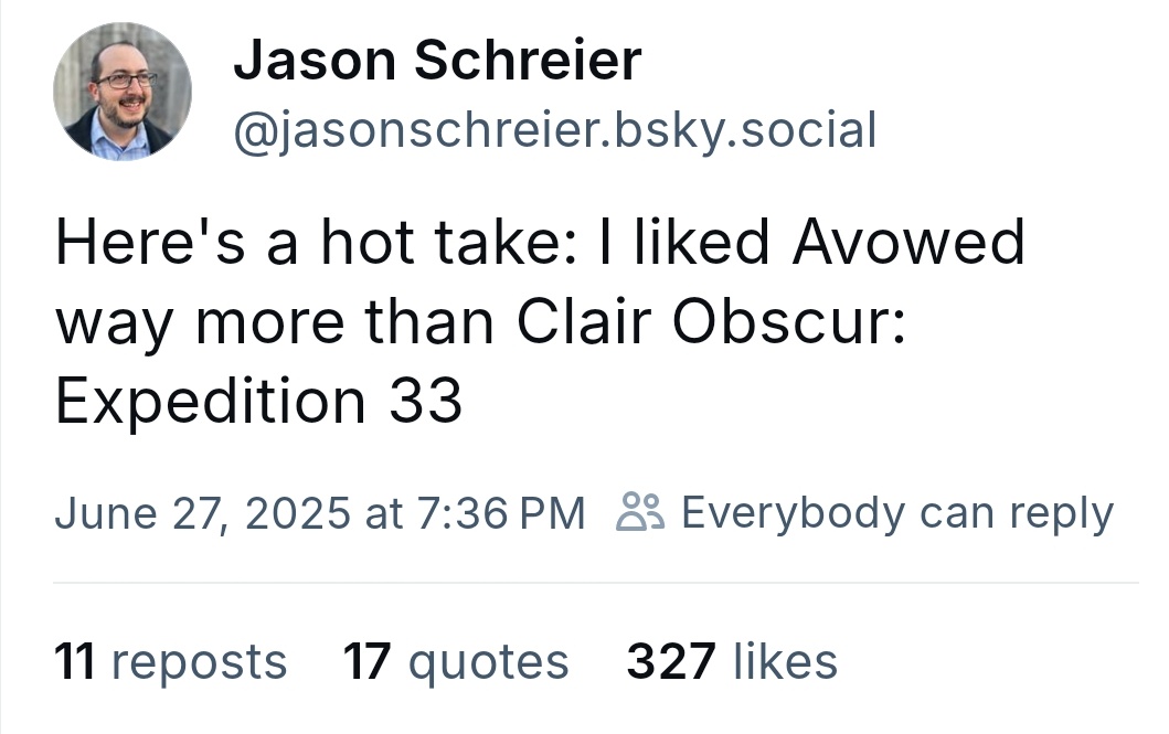 >>10155174 >смотришь на одного из самых известных игровых журналистов >он не любит студии которые состоят из белых мужчин >он не любит экспедицию 33 игру про белых людей, но любит повесточный авовед >он оказывается евреем >хейтер экспедиции моментально устраивает перефорс