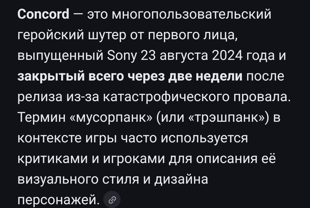 А также про highguard, если знаешь о таком. concord стал мемом года по провалу: сони впарила 400+ лямов зелени в геройский лайвсервис с уродами вместо персов, вышел за 40 баксов + баттлпасс - пик 700 онлайна в стиме, закрыли через 2 нед. сыр-бор из-за того, что это был их флагман после helldivers 2, а умер как антик, ждали амеры - нихуя, все слились на path exiles 2 и slay spire 2. шутки про dei-монстра (жирные трансгендеры, рандом гендеры), "concord - это когда твоя вайфу из fortnite набрала вес", "sony убила сингловку этим дерьмом", мемы с могилой и "RIP concord, born dead".