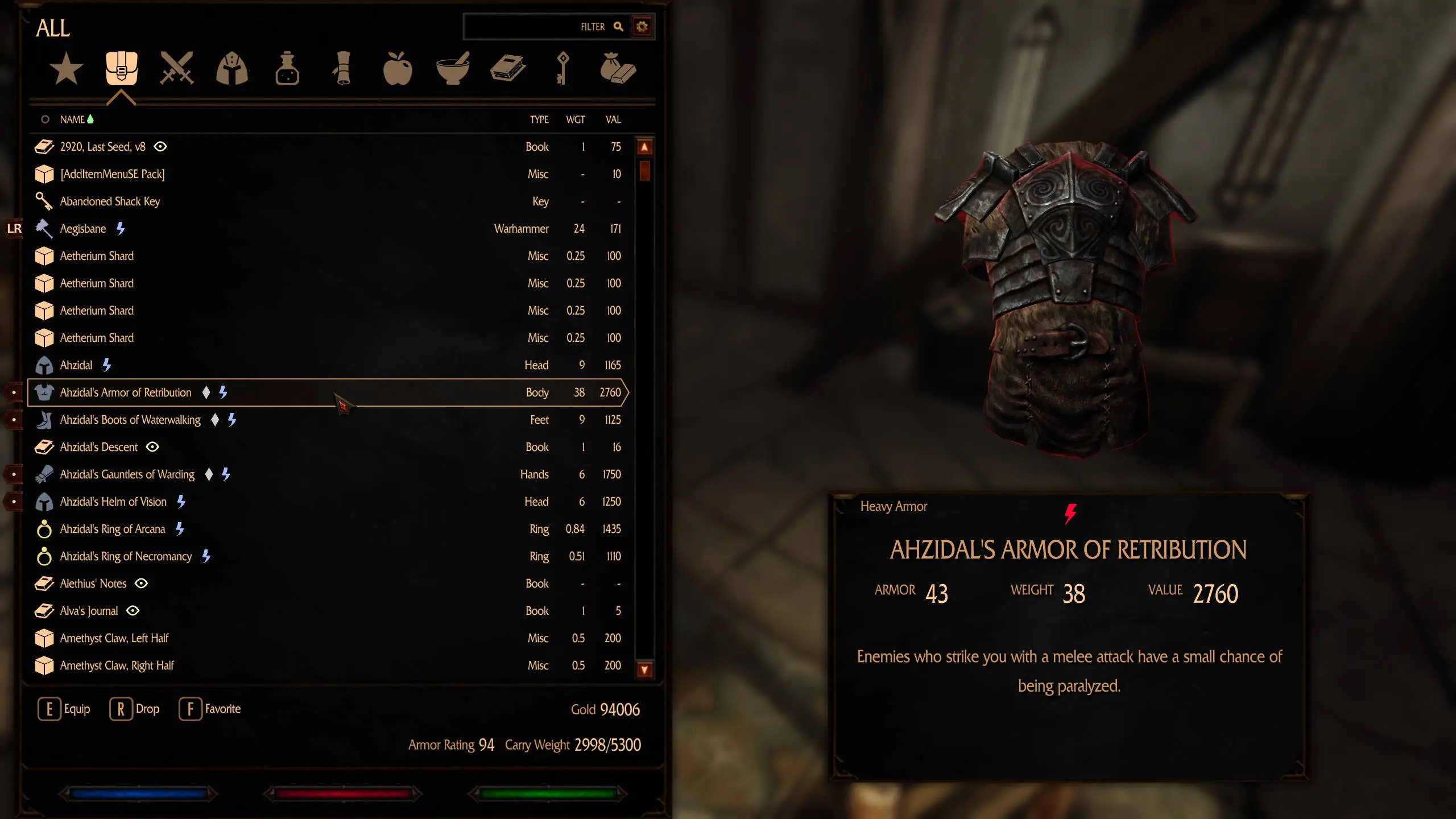 >>10165524 Визуальный мусор - это твой пост. Инвентарь разделён на два экрана и оба используешь по разному. Слева получаешь суммарную информацию, вкупе с иконками и столбцами статов. Справа - рассматриваешь вещь полностью, вместе с её 3д моделькой, которую кстати можно разглядывать с разных сторон, и со свойствами. Молнии разные потому что в одном месте это индикация что это магический предмет, а в другом какого характера магическое свойство - атакующее, защищающее, или делающее что-то ещё, которое тебе нахуй не нужно когда ты оцениваешь картину инвентаря в целом. >Ну и плюс бездонный инвентарь, где ты можешь носить 20 клеймор и 5 доспехов в кармане это всегда хуйня. Это же Скайрим, можешь настраивать как хочешь - хочешь делай себе сурвайвал как в резиках, хочешь бездонный. Я играл с реквиемом - там почти все предметы ванильные, только носить можешь намного меньше, что-то вроде 70 ёмкости на старте и +5 на лвлапах против 150+15 на лвлапах в ванилле, точные цифры не помню.