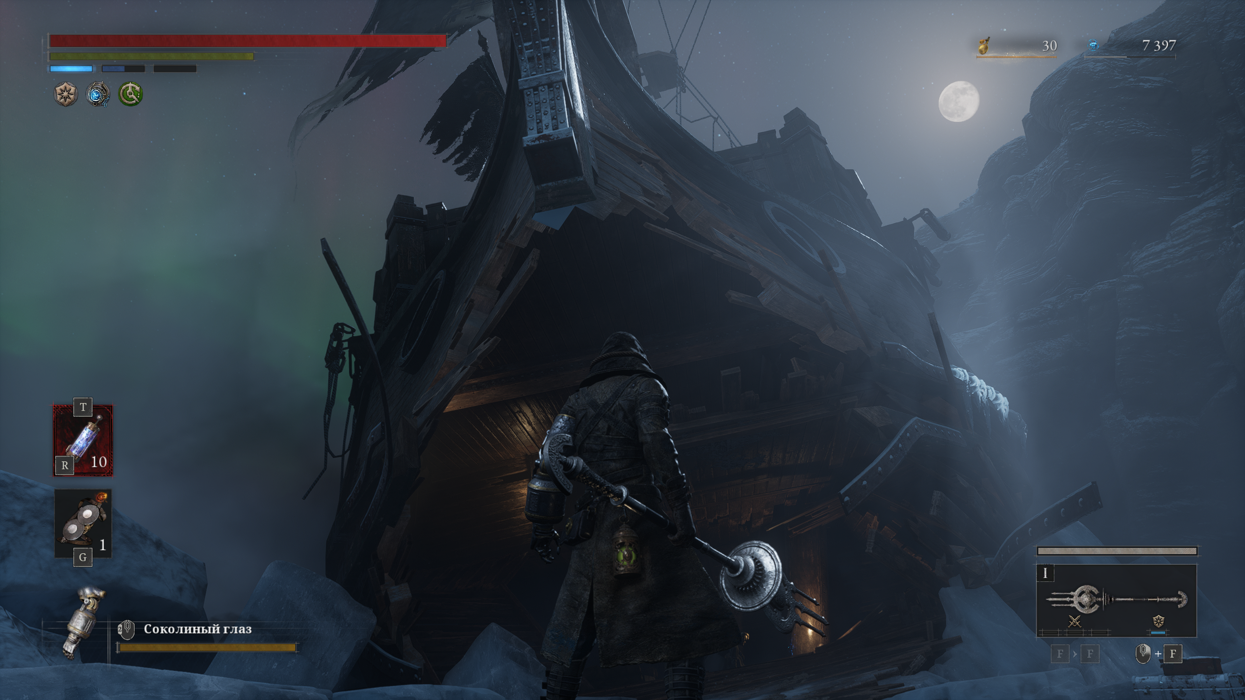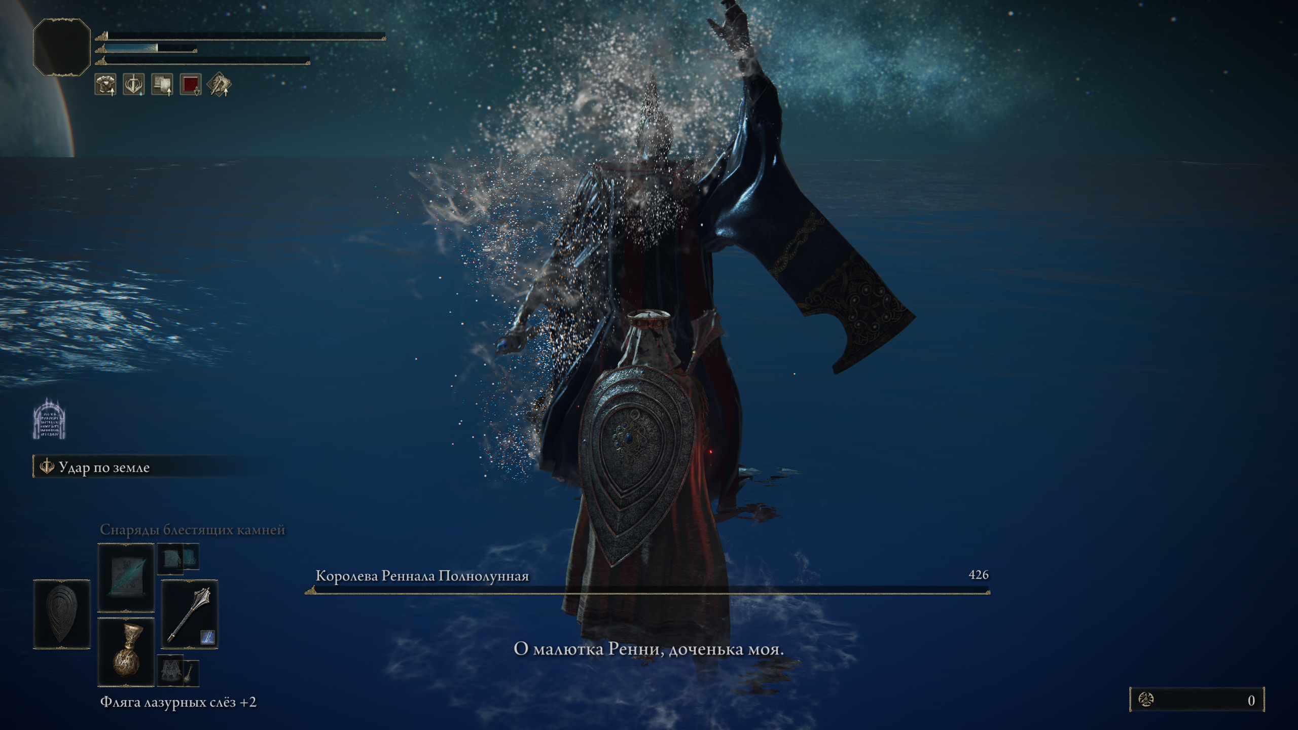 Убил Ренналу первый раз. Можно сказать, задавил мейтинг прессом. Прыгал на нее с зачарованной булавой +13 и пеплом "Удар по земле", пока не откисла. Хотя вообще хотелось из перса сделать эдакого спеллсворда, ловко порхать вокруг врагов с магическим мечом и заклинаниями. Но я анскилл, плохо уклоняюсь от атак босса. И магический меч (Кристальный +4) наносит не то что бы много урона. А вот удар булавой по земле это да. Наносит дохуя урона и его уже не прервать, если перс подпрыгнул. Что позволяет спамить боссов. Убил так уже несколько незнакомых Но всё-таки буду учиться махаться мечом. Нашёл вот меч карианского рыцаря и катану лунной вуали. Первый меч по-моему идеален, уже свичнулся на него с кристального. Красивый, быстро машет, скейлится от мудрости. Его особый приём - это то, чем хотел драться всю игру, но не мог себе позволить - на кристальный меч нельзя вешать пеплы. Хотя он и медленный, постоянно получаю дэмэгэ во время как раскручиваю магический двуручник. Катана выглядит тоже супер сочно. Кровотечение имба в этой игре. Но как-то не слишком ролеплейная пушка. Хотя, я уже кучу времени пропрыгал на врагов аки Смоуг из дс1, наверное махач катаной отыгрыша уже не испортит. Пока можно вкачать и то, то - есть много камней мрака до +4 включительно. А дальше придется выбирать