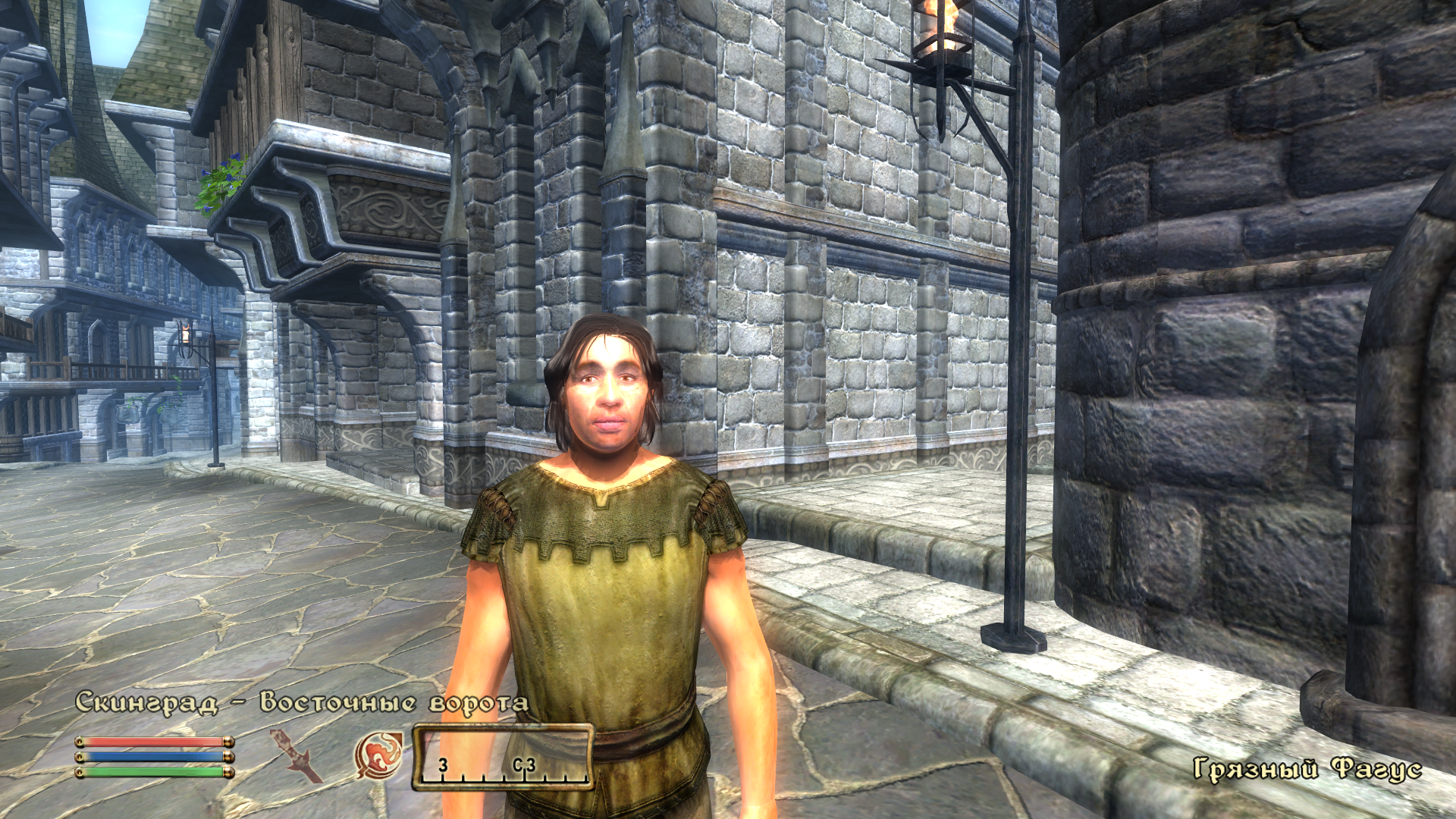 "И Morrowind, и Oblivion, и Daggerfall поражали игроков красотой в самое сердце. Со «Скайримом» такого не будет. По сравнению с Oblivion (игрой пятилетней давности!), серьезных улучшений в графике заметить не удается. Возможно, в движении картинку чуть улучшит эффект последних технологий Havok — подчиняющаяся законам физики вода, анимация растений и тканей. Визуально игра местами даже выглядит устаревшей — всему виной угловатые модели. Низкополигональные камни еще можно потерпеть. Но эти «сломанные» руки главного героя в кадре ужасны. Локоть из трех с половиной треугольников на половину экрана — совершенно неприемлемый уровень для 2011 года. Виной тому, конечно же, приставки, которые со своим древним железом снова начинают тормозить прогресс технологий. Помните GTA: San Andreas, который искалечили, «утаптывая» в ограничения PlayStation 2? Кажется, история повторяется. Но негров-гангстеров хотя бы не было жалко. Для игры серии The Elder Scrolls устаревшая графика может оказаться приговором. Разработчики уже подтвердили, что серьезно улучшать ее для PC не будут, ограничившись повышенным разрешением и полноэкранным сглаживанием. От «сломанных» рук и квадратных пальцев не спасет ни то, ни другое. Обещания радужные, но попахивают они лапшой. Разработчики обещают, например, что, если герой выбросит в каком-нибудь городе ненужное оружие, его может подобрать услужливый NPC — дескать, господин потерял вещичку, — или же за ценную железку могут подраться прохожие"