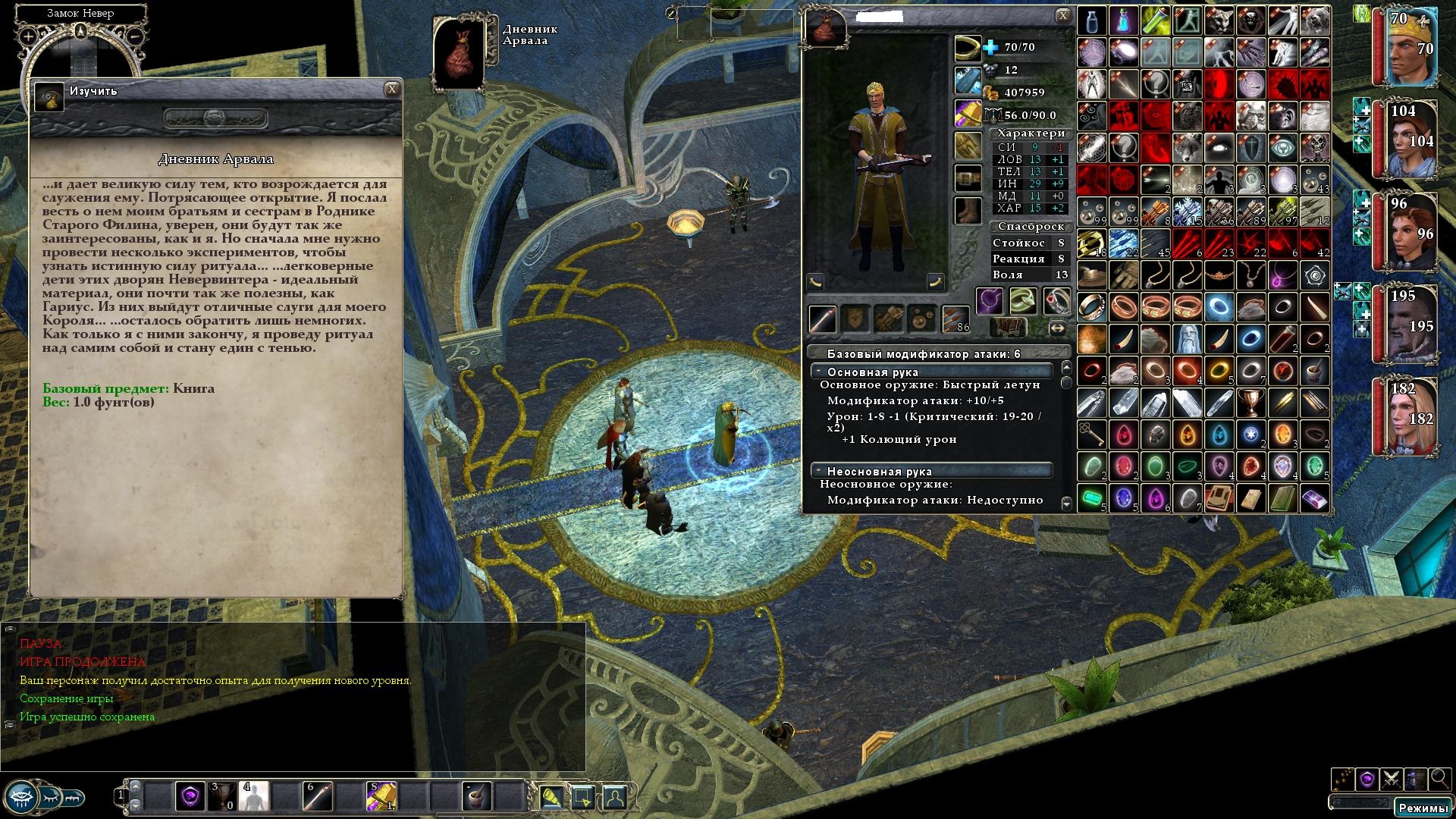 вкратце (не в кратце) распишу прогресс ОПа в ОС ванильной нвн2 до начала 2 акта. первое - ставим мод на увеличенный текст и в целом интерфейс. Tchos HD UI называется, есть на нексусе. для русика дополнительно ставим фикс для non english language. играть нужно очень приятно магом, что я и делаю. гг добрый волшебник с переходом в тайного ученого кэндлкипа (школяр). крафтер, абузер навыка оценки. школяр имба. фит улучшенного усиленного заклинания невероятно силён. буквально единственное что теряет чистый визард - бонусный фит на каждом 5 лвл. напарники в ОС имеют чистые классы. это может и скучновато, но чувствуется какая-никакая специализация героев, да и ОС легкая даже на максимальной сложности, к сожалению. келгар воин и с правильными вещами проходит игру соло, т.к. в ОС очень много вещей с иммунитетами и относительная слабость воина к магии ими нивелируется, крафт же позволяет создавать вещи, которые по лору не все полубоги имеют. нишке был придуман, обдуман, реализован (успешно) билд через тяжелые арбалеты. лично я считаю его лучшим билдом для нее в плане соотношения простоты геймплея и профита. элани это фактически саппорт, может и пострелять, и в мили, и кастовать. но конкретно с точки зрения силовой игры у нее есть одна наиболее сильная роль, которую не могут исполнять другие - крафтер "святого" энчанта на пушки, требующая заклинания исцеления серьезных ран. остальные спутники фактически подсосы и существуют для красоты. гг маг как безальтернативный в партии, келгар как лучший танк и мили дпс, нишка как вор-сапёр уже проходят всё и проходят комфортно. 4 и в последующем 5 члены берутся по настроению. это не значит что их не нужно оптимизировать (нужно). просто нужно брать под определенную карту для лишних диалогов и т.д.