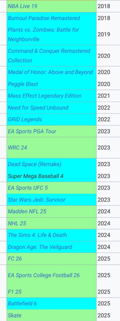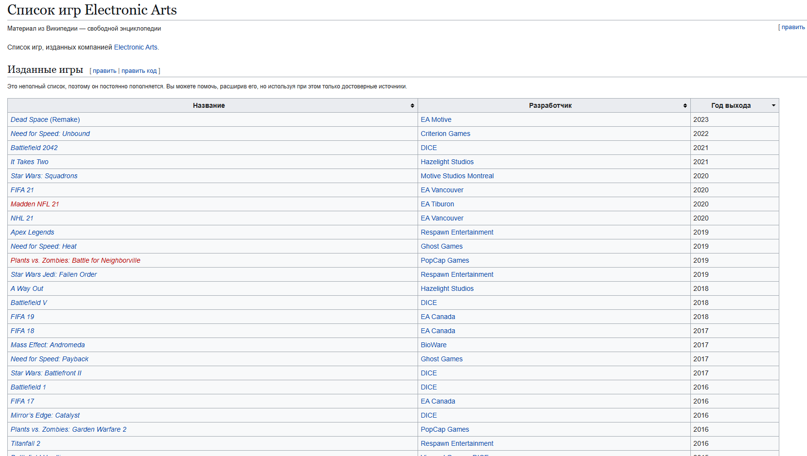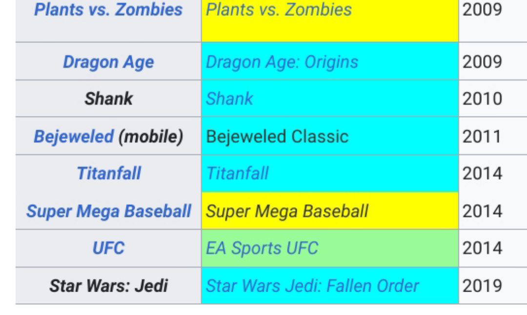 >>9820128 Я самым честным образом не смог припомнить когда же я последний раз играл в игру от ЕА. Полез смотреть на Википедию. Первый пик - последние "оригинальные" игры от ЕА. Второй пик - остальные их последние игры. Наглядно видно что они уже больше пяти лет не выпускают по сути ничего кроме спортивного хрючева и пары-тройки гойслоповых демастеров. Кто бы мог подумать что этого окажется недостаточно чтобы остаться на плаву и придётся идти на панель торговать собственной сракой.