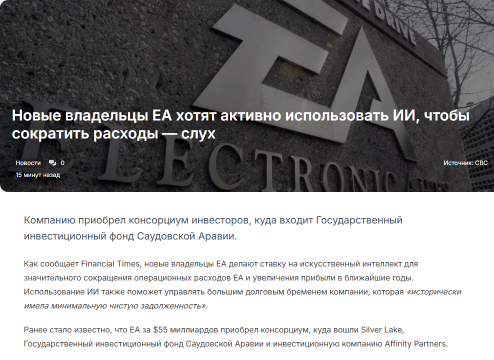 СМИ: новые владельцы EA намерены «существенно сократить» расходы благодаря ИИ