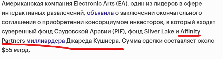 Сосачеры как обычно не читают дальше заголовка. >Under the terms of the deal announced on Monday, the private equity firm Silver Lake Partners, Saudi Arabia’s sovereign wealth fund PIF and Affinity Partners will pay EA’s stockholders $210 per share. Affinity Partners is a private equity firm run by Donald Trump’s son-in-law, Jared Kushner. То есть EA на троих купили две инвестиционные фирмочки а ля маленький Блэкрок, одну из которых возглавляет буквально (((Кушнер))), и арабский фонд , который вкладывается вообще во всё подряд, и, к слову, имеет долю в той же EA уже с 2021 года - а ещё в Take-Two, Activision Blizzard, ex-Embracer, там-дам-дам, Capcom, Nexon и Nintendo. Но сосачеры уже пустили теплую струю в штаны, фантазируя о базовичках, получивших в свои руки погрязшую во грехах EA.