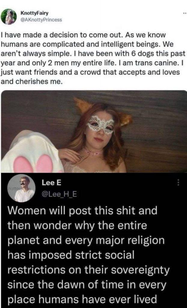 Есть причина почему все религии мира всегда универсально ограничивали женские закидоны. Есть причина почему теже общества в которых сейчас доминирует Ислам имеют адекватную рождаемость и не скатываются в культурны ад, в котором прибывает современный запад.