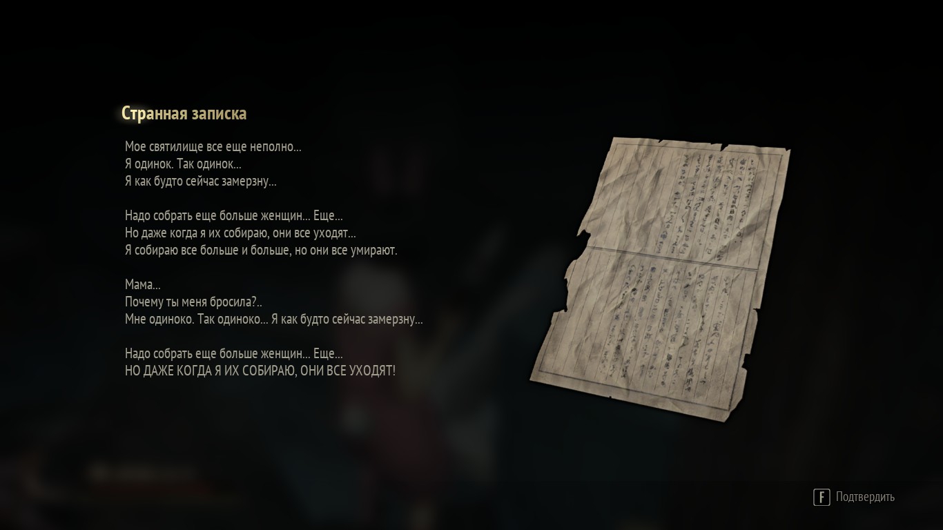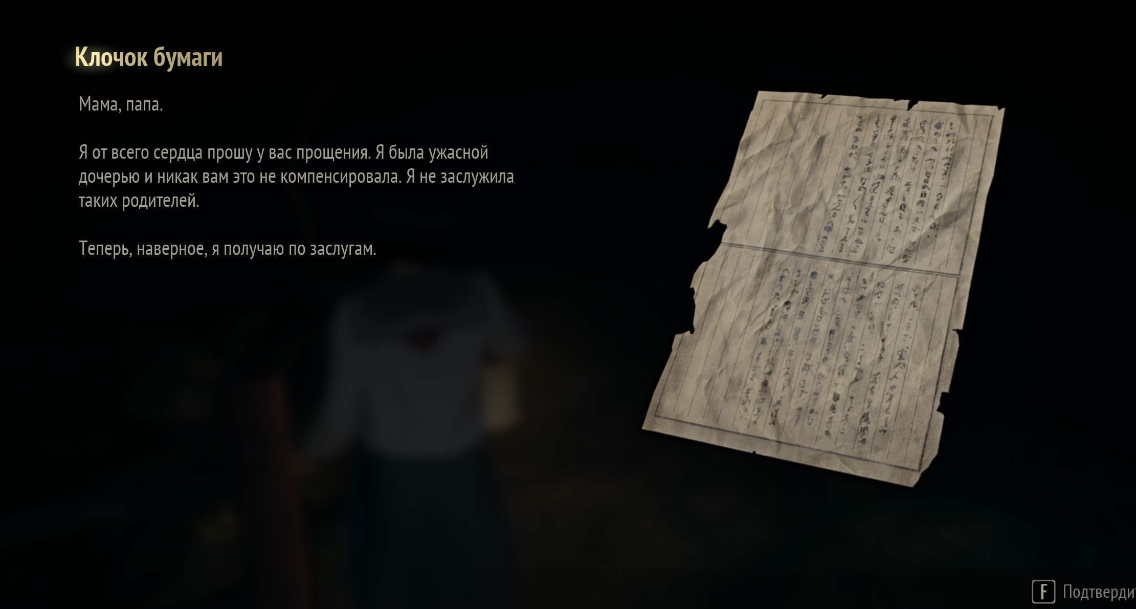Ебать, а эту записку не обсуждали? На нг+ из сарая возле хаты Сю. На полу там еще тела дохлых манекенов валяются. СЮ МАНЬЯЧИНА ЭПИЧНЕЕ ДЖЕЙМСА??? К Хинаке относится как к богине, но сублимирует отсутствие секса убийством рандомных тян забредших в лес?