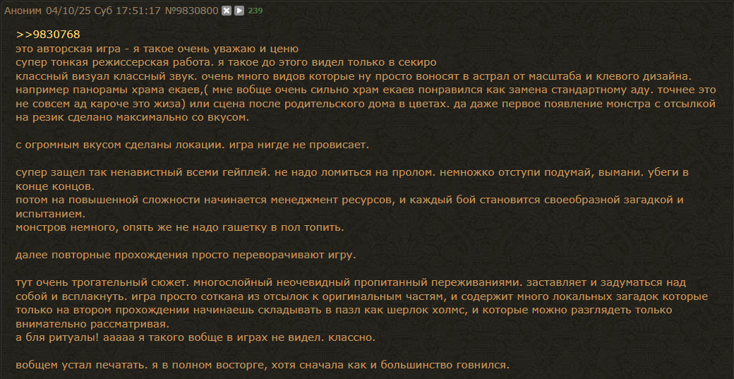 >>9830768 это авторская игра - я такое очень уважаю и ценю супер тонкая режиссерская работа. я такое до этого видел только в секиро классный визуал классный звук. очень много видов которые ну просто воносят в астрал от масштаба и клевого дизайна. например панорамы храма екаев,( мне вобще очень сильно храм екаев понравился как замена стандартному аду. точнее это не совсем ад кароче это жиза) или сцена после родительского дома в цветах. да даже первое появление монстра с отсылкой на резик сделано максимально со вкусом.