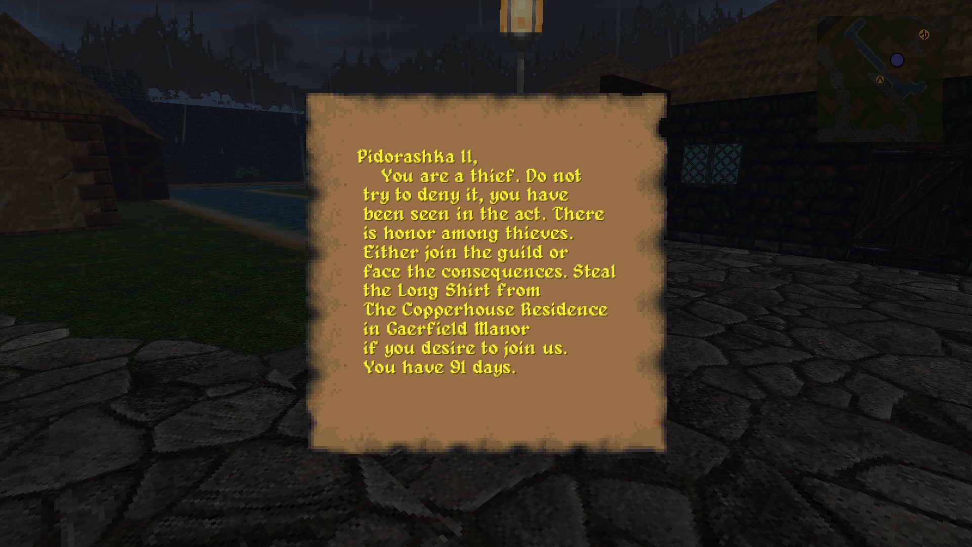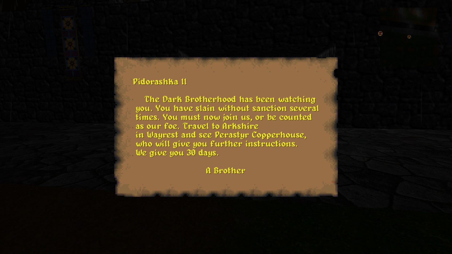 Меня повысили в гильдии блядей я теперь элитная эскортница. Устроил небольшую мясорубку в Даггерфоле пытаясь прокачать воровство. Блять такой кал ебаный каждый раз ложиться спать, чтобы прокачать ОДИН лвл характеристики это дрочь блядь. Сбежал в вейрест, мне тут пихнули две записки с приглашением в гильдии воров и темное братство. Че куда идем))? Вообще я хотел в гильдию магов, но там требования ебанутые, пытаюсь прокачать какую-то одну школу, чтобы взяли. Короче, надо поставить мод, чтобы статы блять качались без отдыха. А то меня это реально заебало.