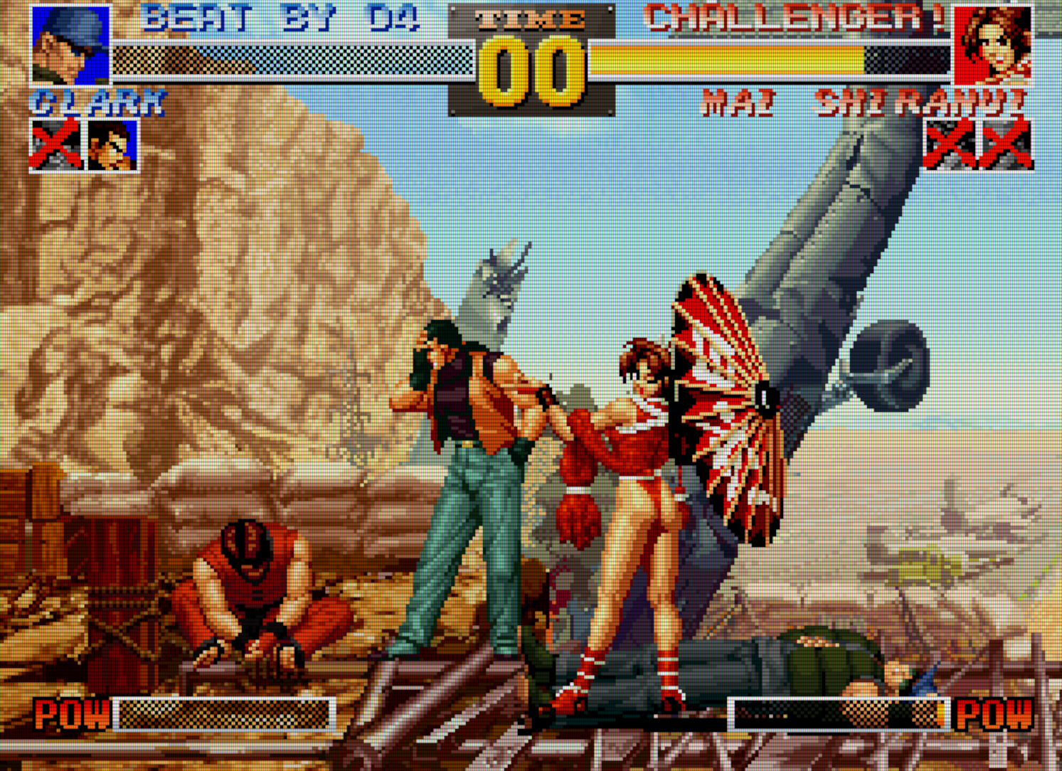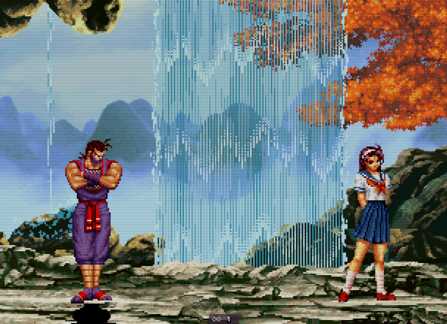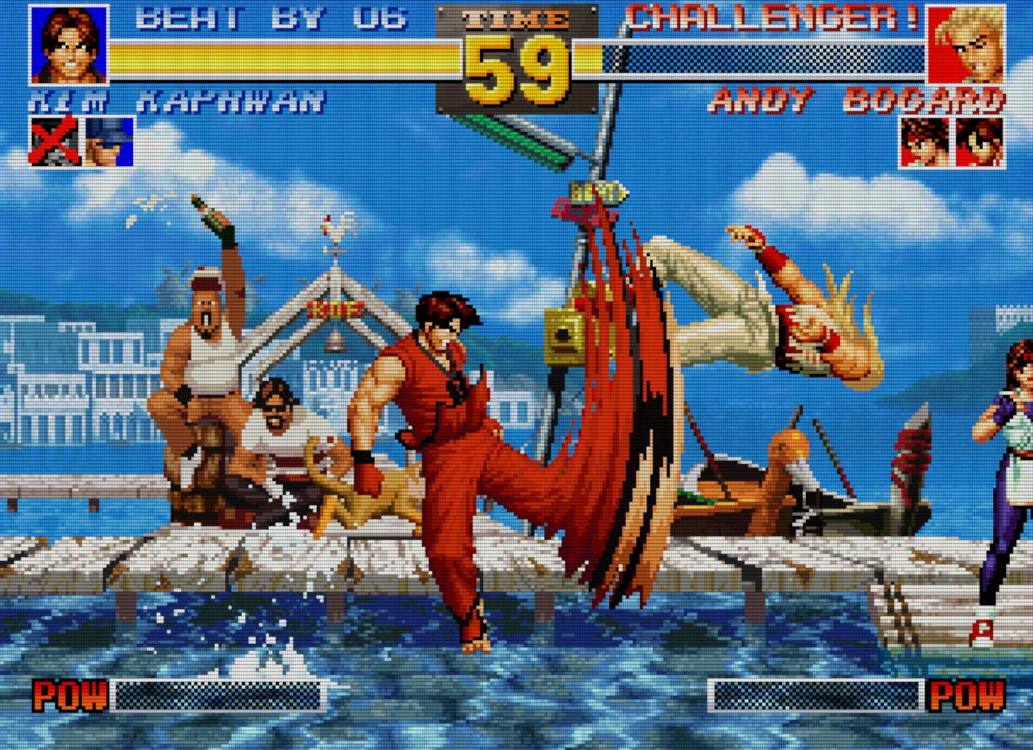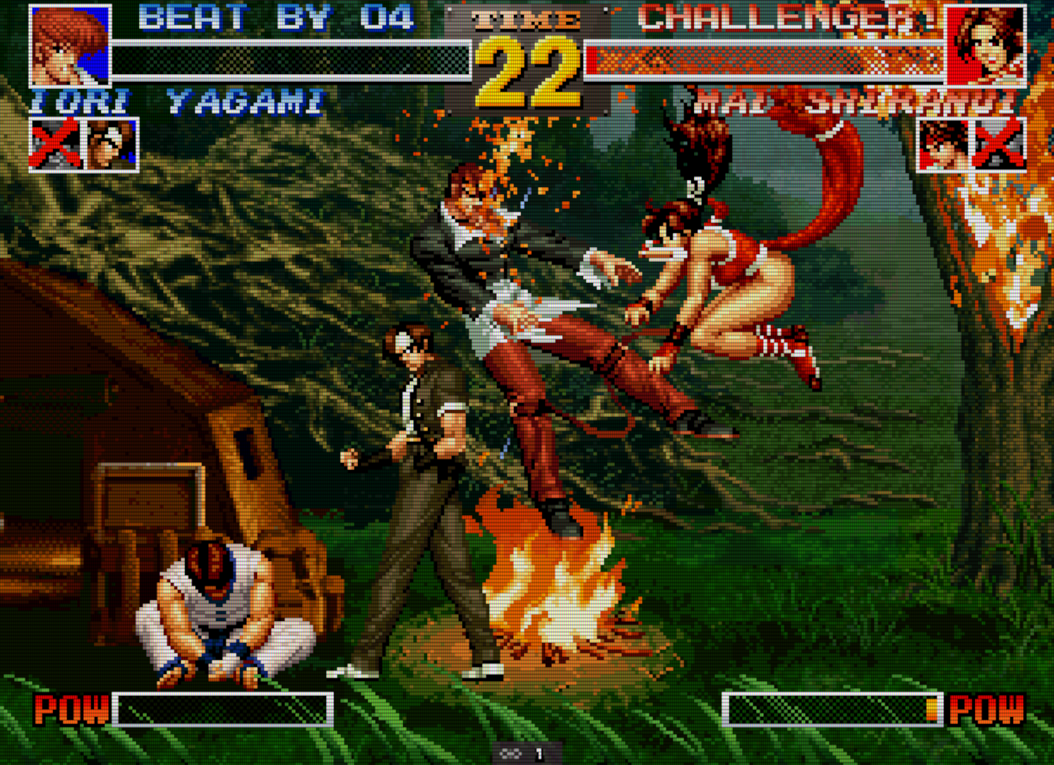 От корейцев не отбиться сегодня, все хотят сыграть в 95-й КоФ. Спору нет, игра крута, вроде как любимая часть Сакурая, но нет шорт-хопов и половины знакомых мувов, без которых чувствуешь себя инвалидом. И мы отвыкли от того, насколько быстро заканчивалось хп в старых файтингах. Зато локации прекрасны, особенно вот эта голубенькая. Музыка тоже хороша; дизайн Афины один из любимых; в отличие от '94 можно выбирать персонажей из разных команд. Хорошая игра, но морально устаревшая даже в сравнении с '97.