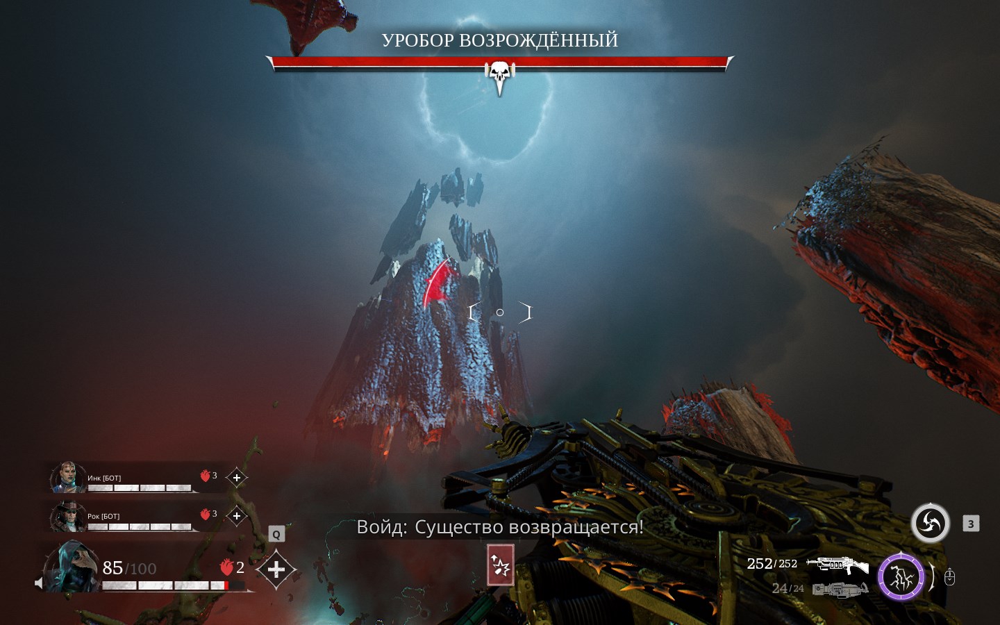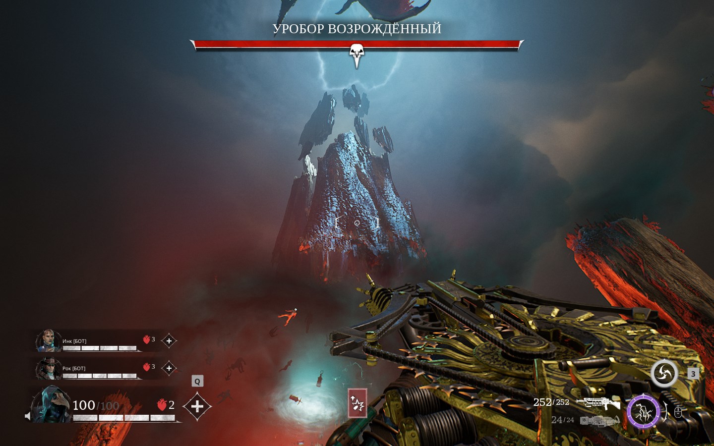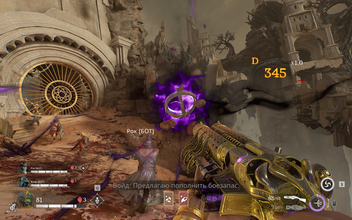 Плюс ко всему, у каждой пушки серьезный такой секондари режим, и опять же, как верно подметили, кор игры - кооп, то есть, например, микрочел может стянуть чертей в одну кучу с помощью секондари коломёта, а ты уже можешь выпустить одну ракету, разьебав эту кучу на ошмётки.