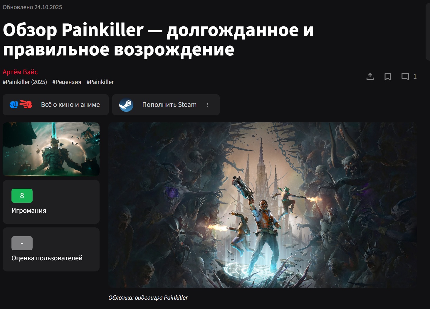 Не слушайте протыков и бегом качайте Болеутолителя, потому что это чёткая игра. К тому же есть кооп. В игре есть крутые пушки, страшные деманы, бодрый мувемент, красивые локации и другие составляющие адреналинового спиномозгового шутера, а такие игры мы любим. При этом играется приятно, оптимизон хороший. Таких игр кот наплакал! Никакие Abyssus-ы, Remnant-ы и Witchfire-ы даже рядом не стоят. Painkiller 2025 гораздо пизже нового Borderlands 4.