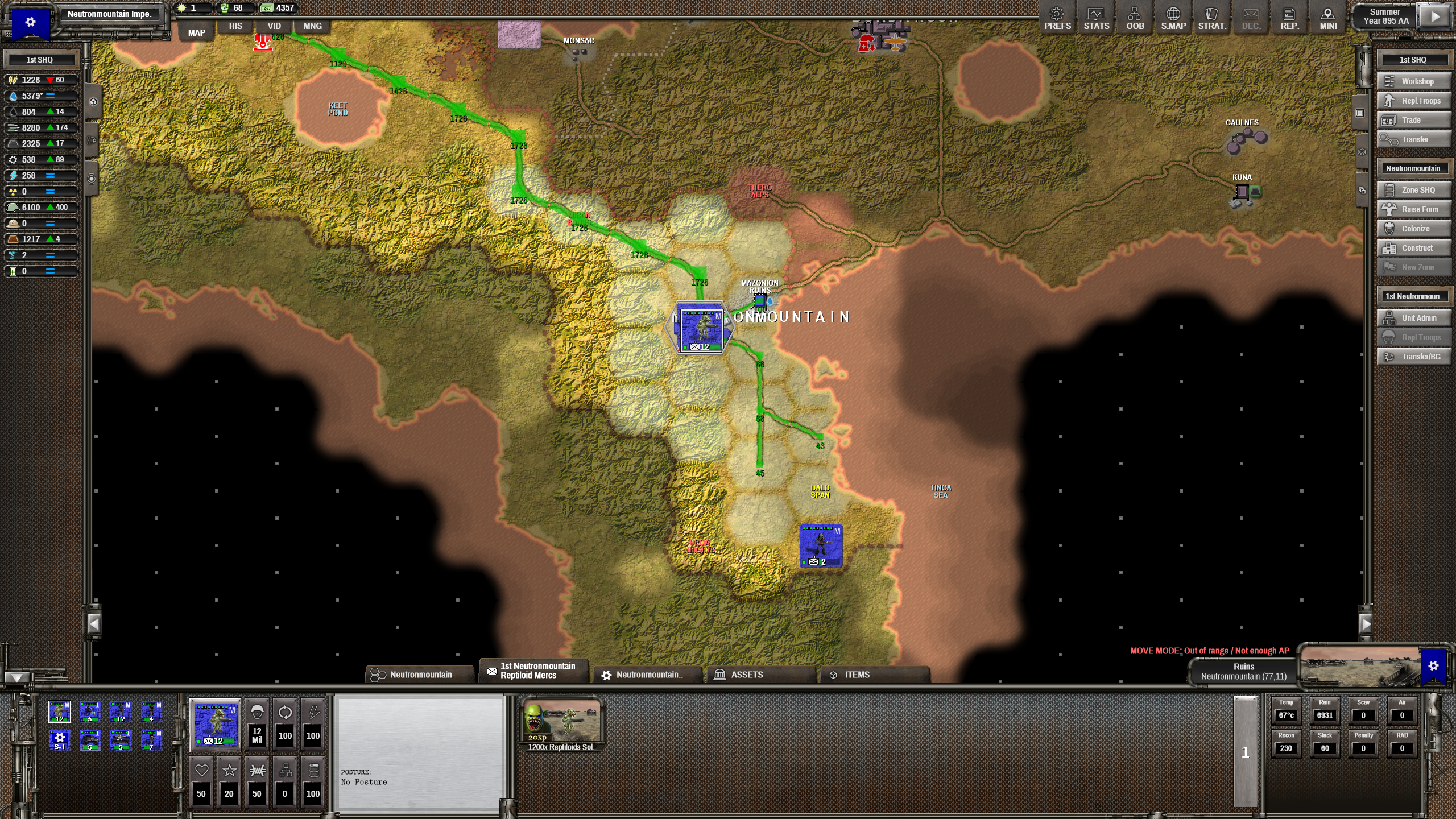 Без восточного соседа, наконец, что-то изменилось. Удалось собрать ударную группировку и начать очень медленно, потихоньку теснить ксеносов. Горы, круглогодичные ливни, видимость нулевая, засады на каждом шагу и укрепленные позиции через метр. Но кое-как дело идет. Получилось даже отстроить маленькую танковую группу, на один выезд которой ресурсами скидывается вся страна (ведь их нет - топливо в гомеопатических дозах собирается из руин). Поэтому они особо никуда не ездят - только, если уж совсем никак... Город из-за вечной опасности то бунтует, то бросается в забастовки - никто не работает, некого призывать, а население даже брать неоткуда: в этой ебучей локации нет ни одной деревни (первый раз такое вижу)! Но, если отогнать ксеноугрозу, станет получше. Северное племя рептилоидов я даже разбил. А с западным пока задружился и нанял немного их солдат, которые по меркам моего уровня даже очень неплохи.