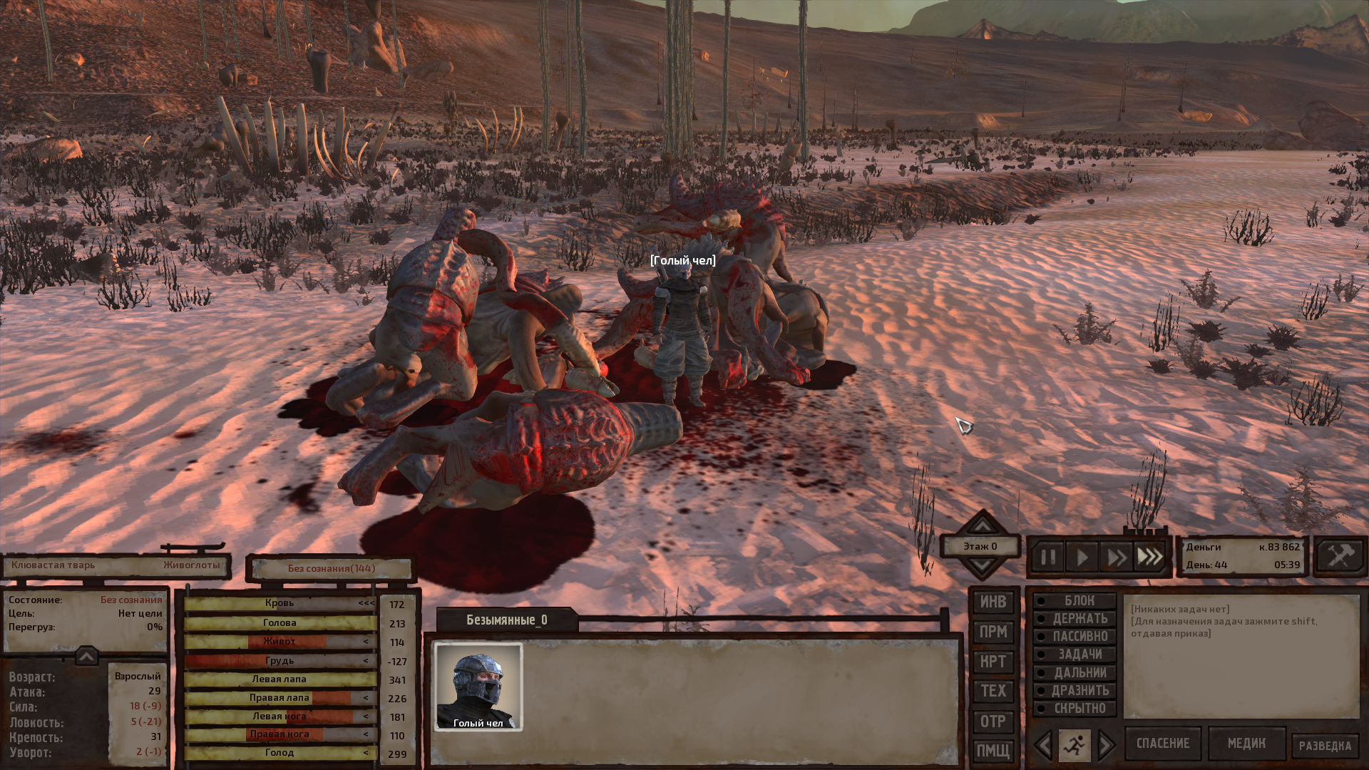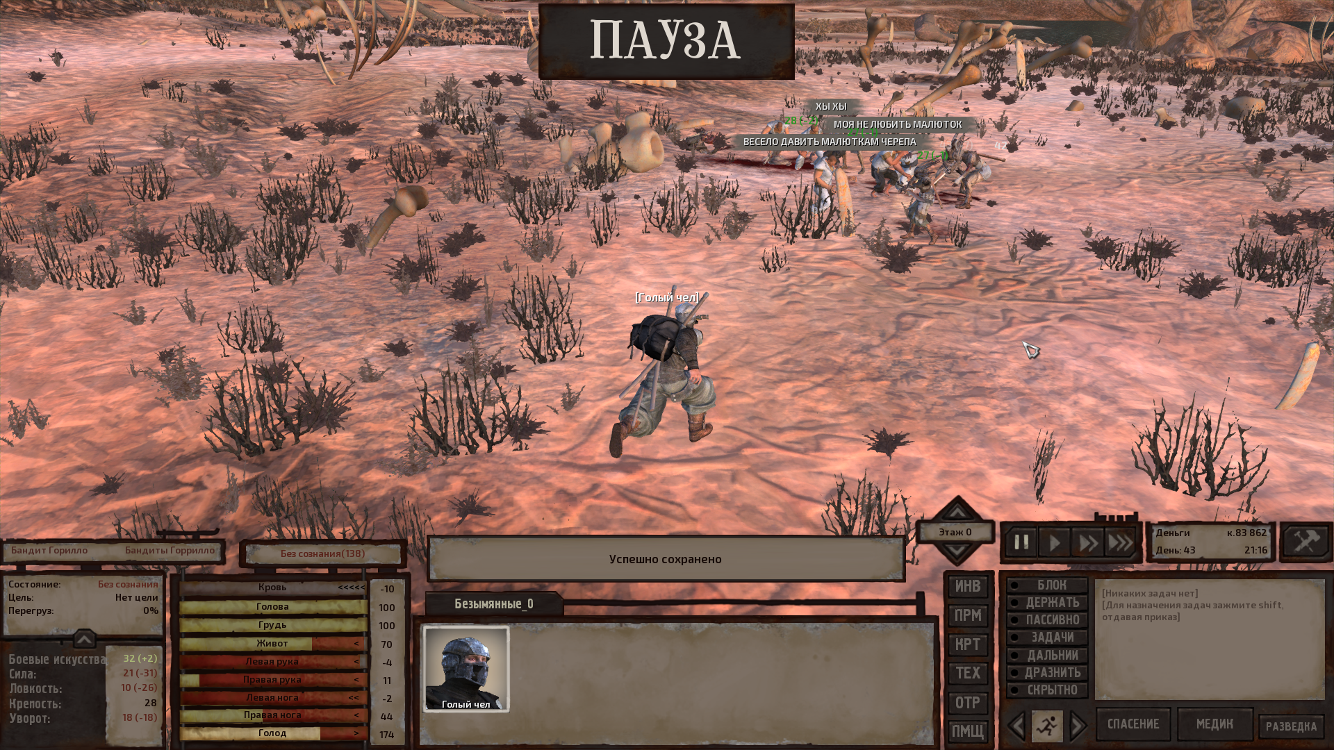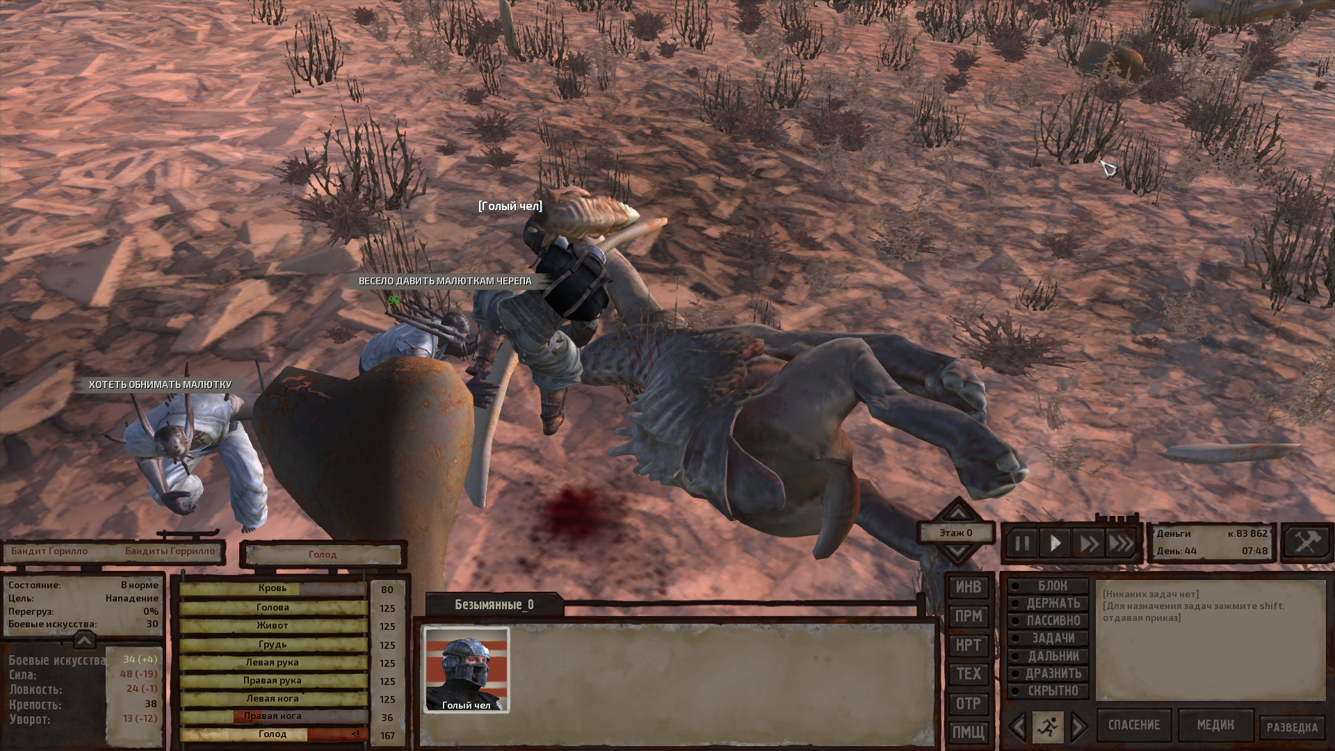 Как же хочется научиться играть в кенши. Каждую мою сессию мне дают пизды, я огребаю потом либо ползаю инвалидом без возможностей каких-либо. Либо ловлю софтлок, потому что меня группа тех паладинов за протезы ловит и по пустынному патрулю водят 40 дней и ночей пока я не сдохну от голода.