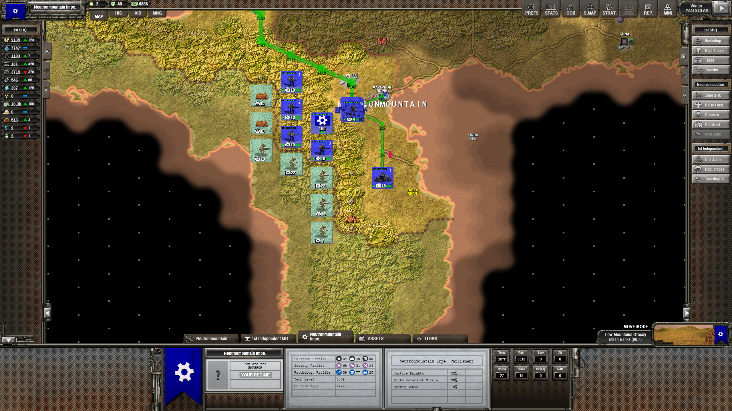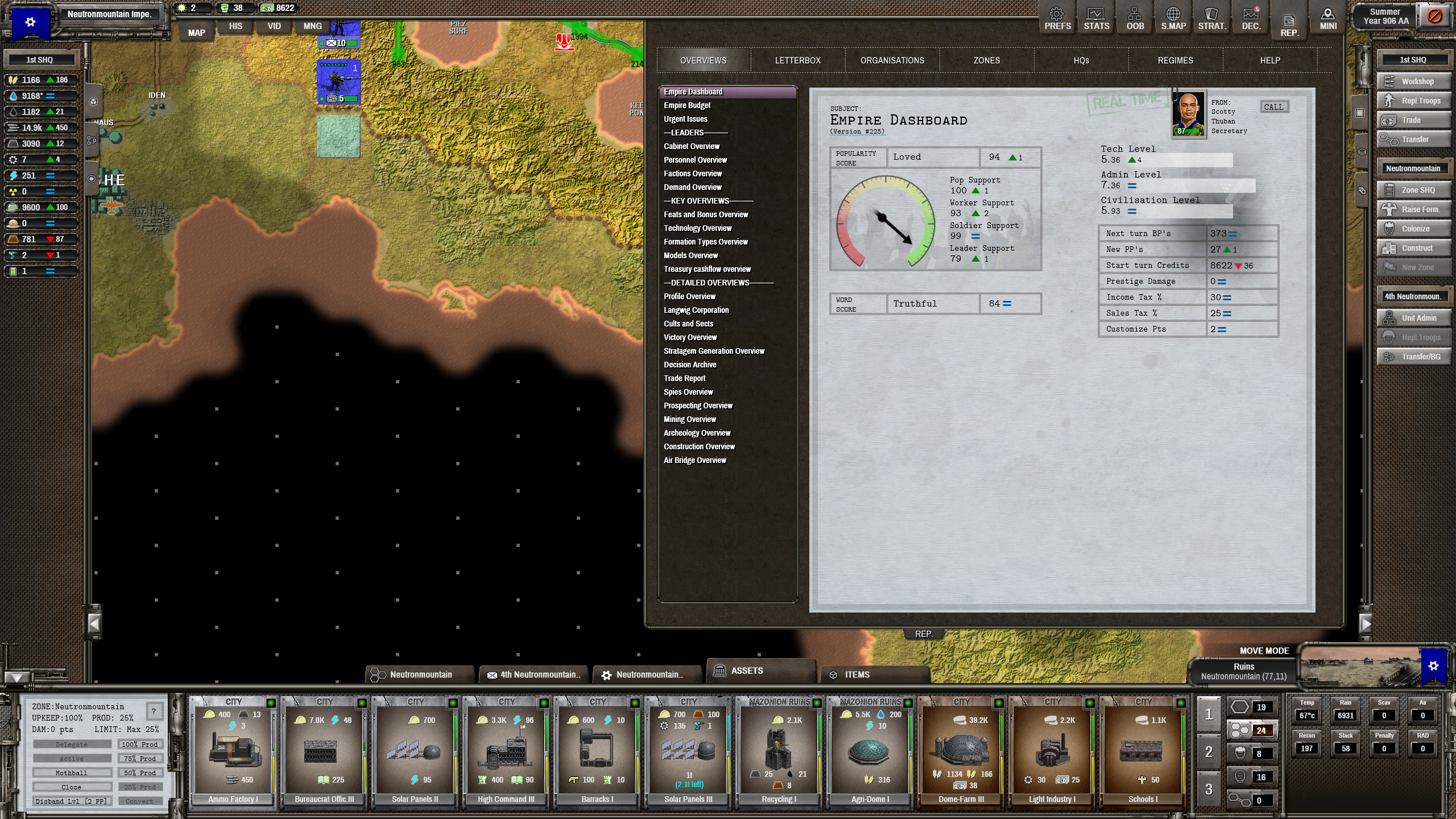 Началась вторая рептилоидная война. Далеко на юге есть аж целая одна клетка руин, из которых можно залутать хоть какие-то ресурсы. Это, конечно, мелочи, но куда больше, чем нихуя вообще. Заодно нужен хотя бы один вулкан, чтобы добывать из него энергию - энергоносителей-то у нас тоже нет. Ради такого случая парадная танковая группа выехала деблокировать южную дорога (потратив половину бюджета страны), пока на западе пехота рубится с ксеносами за каждый аул. Параллельно решили отрицательно добавить рабочим возможность голосовать, которую установили прошлые министры. Но они были либерахами, так что пришлось их разогнать. Одна либераха спалилась своим недовольством уже на этом референдуме, за что была отправлена в почетную отставку. Теперь все нормально: земли худо-бедно отвоевываются, никто не бунтуют, народ любит своего лидера, а мигранты прибывают целыми городами, потому что на фоне войн восточных государств их стандарты жизни упали даже ниже моих. Теперь мой прирост населения - на 90% миграция, плодиться в этих горных ебенях в единственном городе очень непросто.