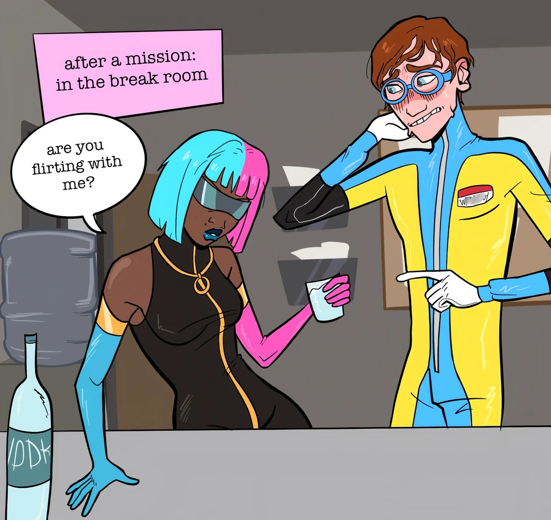 Я, кстати, немного спизданул - симпатию Инвизипися проявляет ещё во втором эпизоде: оставляет пончик на рабочем месте героя в качестве примирения за то, что вмазала ему(который потом размазывает по клаве из-за обиды). Но это настолько ненавязчивый момент (в отличие от блейзерских гурупикапских мувов), что из головы вылетел.