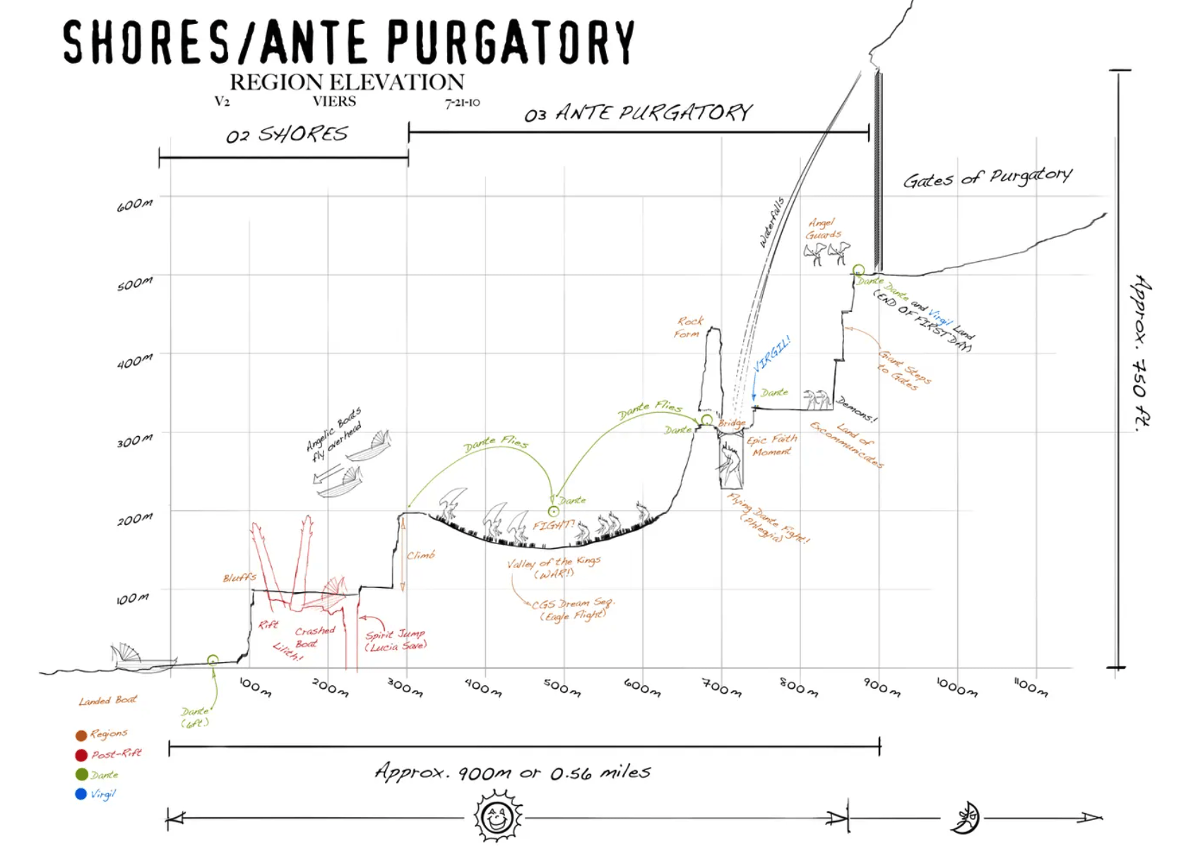 -Ключевая цель Данте состояла в восхождении на вершину горы и последующим вознесением в рай. По мере прохождения героя ждали разношёрстные персонажи — от архангела Михаила и римского сенатора Катона до святой Люсии и Вергилия.
