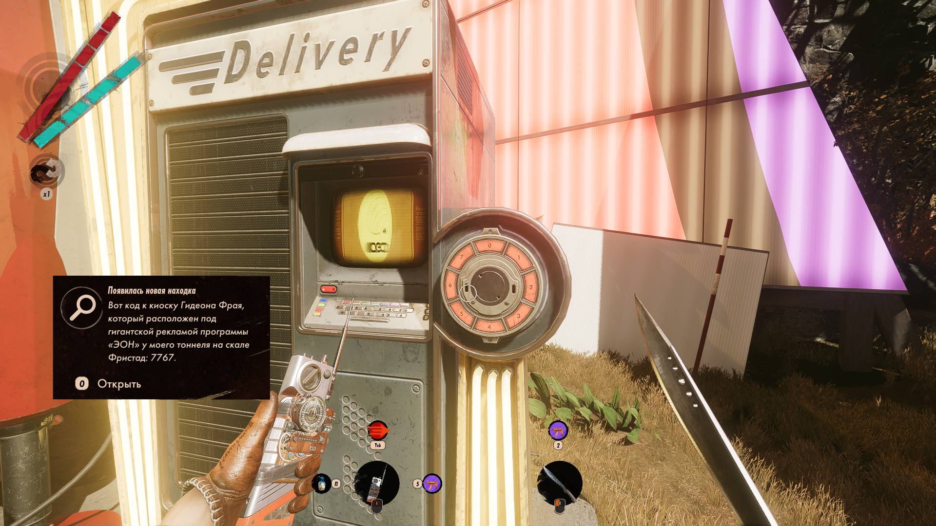 Бляяя ладно ща кайфанул слегка. Увидел какой-то код при повтором занюхивании локации и думал куда его ввести. Решил по приколу попробовать в газетный киоск в другом месте и он сработал. Это было неплохо. Ни подсказок не было, ни места никак не связаны и находятся в отдалении. Я даже чуть не забыл что можно в киоск вводить пароли. Из минусов я вынес вентиль и оставил снаружи чтобы потом подобрать и он тупо исчез