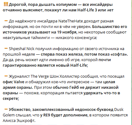 первое что вы подумаете это конечно будет "йоу, че за хуйню несет это двачер" но вы будете не правы. есть уже несколько доказательств того, что халва 3 выйдет уже в этом ноябре. и я спешу их вам перечислить: - Вчера (12 ноября 2025) на презантации стима было показано именно ТРИ девайса а также, на клавиатуре с этой же презентации был найден всеми нами извесный знак лямбды - Осеняя распродажа была перенесена почти на 2 месяца, и это освободило для нас ноябрь от распродаж. за огромное количество времени главная страница стима будет пустовать. не освободили ли ее для HL3? - рокстары перенесли анонс ГТА 6. возможно Габен (которого все знает под псевдонимом "жирный хуесос") слил им инфу, и они перенесли релиз игры из за того что это слишком близко с так долго ожидаемой HL3 и все будут слишком увлечены ей.