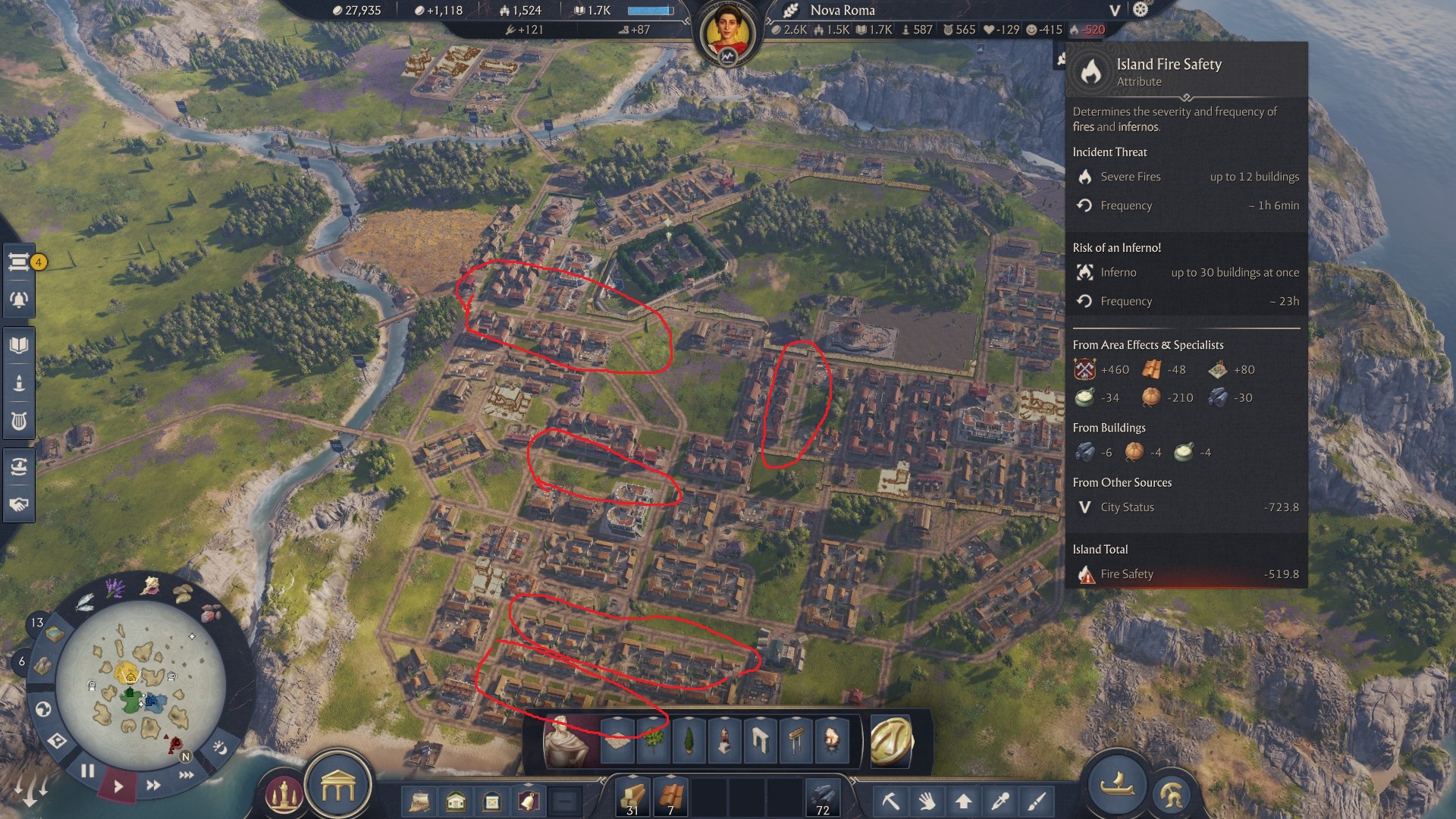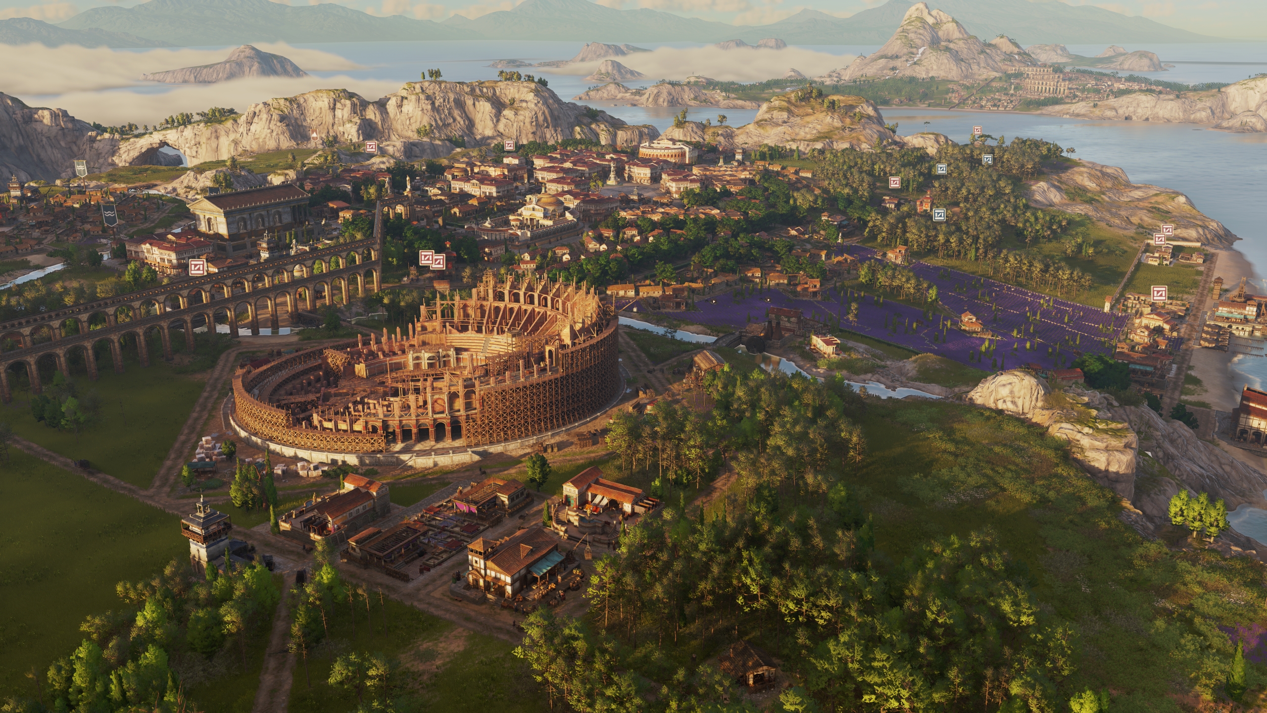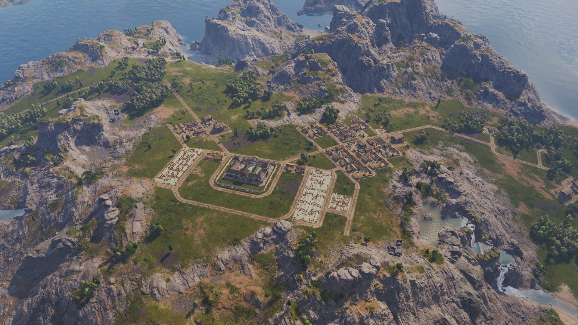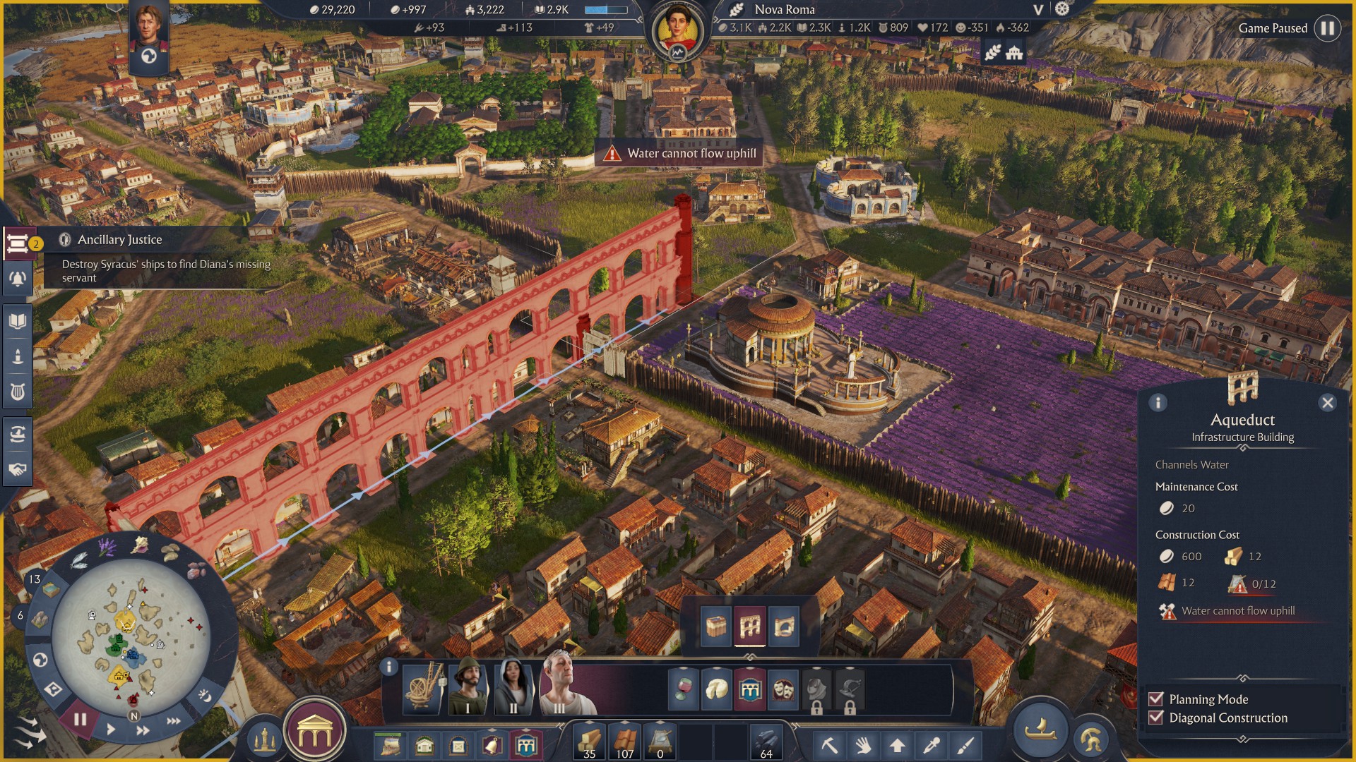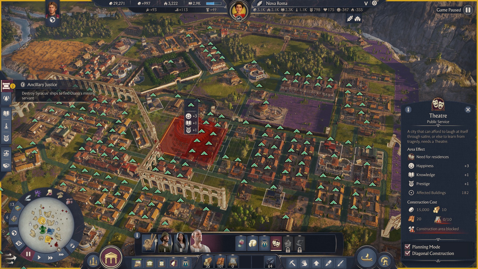 Как и ожидалось, всё планирование пошло по пизде. Внезапно, акведуки используют топографию острова и, снова, внезапно акведук не может идти вверх, только вниз. И пересекаться с другим акведуком тоже, что конечно, вносит определённые корректировки в моё планирование и пускают по пизде весь мой остров и его планировку. Алсо театр оказался ебать каким большим.
