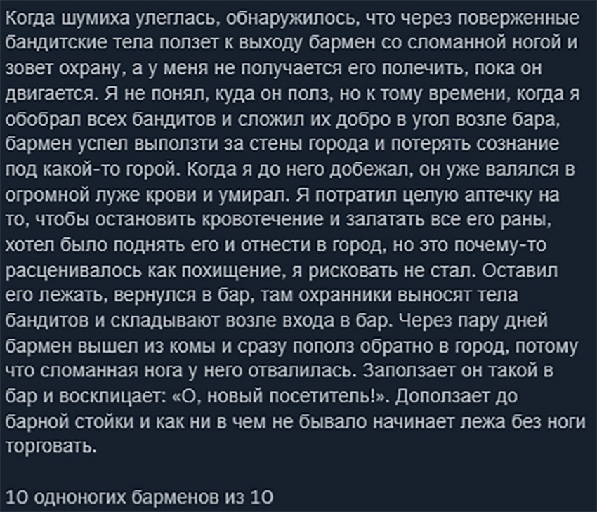 >>9961792 Т.е. весь неебенный отыгрыш и вариативность этого высера то что чел притащил бандитов в сейфзону ко стражникам, а раненные неписи умеют убегать? Вся суть индипараши, походу заходит только даунам у кого это первая песочница.