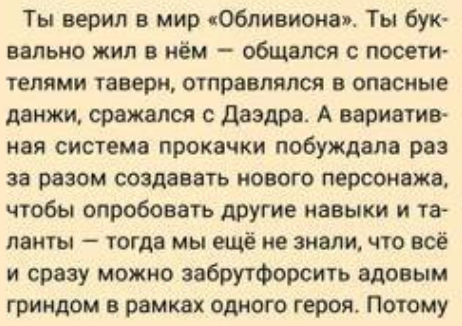 ""Видите ли, с недавних пор игры стали для меня работой — интересной, черт возьми, любимой, сделавшей так, что меня узнают на улицах и лабают в мою честь неумелые фэн-сайты, но работой. Энергию, высокооктановый бензин, смысл жизни я получал способами, имеющими к играм не самое прямое отношение. Так вот, Morrowind неожиданно выдернула меня из реальности, нахлестала по щекам, завела мой мотор так, как это умеет делать только город Лондон, где, например, я могу не спать неделю, чувствуя себя при этом свежим и зеленым пупырчатым огурцом с бабушкиной грядки. Любимый книжный супермаркет Waterstones на Трафальгарской площади превратился в библиотеку темноэльфийского храма, где я провел целую майскую ночь реального времени, не спеша читая фолианты, привыкая к причудливым именам и географическим названиям, въезжая в расстановку политических сил, забыв о миллионе важных дел в настоящей жизни, неисполнение даже одного из которых грозило мне такими ужасными карами, что вы даже не можете себе их вообразить. Я думаю о Morrowind каждое утро, завязывая галстук. Я считаю часы, оставшиеся до момента, когда смогу снова запустить morrowind.exe. Сначала мне хотелось написать что-то громкое о сверхновой масштаба Fallout или Deus Ex. Потом подумалось: это — больше." Ты вот это без смеха прочитать можешь?