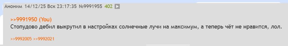 >Стопудово дебил выкрутил в настройках солнечные лучи на максимум, а теперь чёт не нравится, лол. >дебил выкрутил на максимум, а теперь чёт не нравится, лол. >выкрутил на максимум, а теперь чёт не нравится, лол. Логику поняли? Вы хоть сука где-нибудь ещё такое видели?
