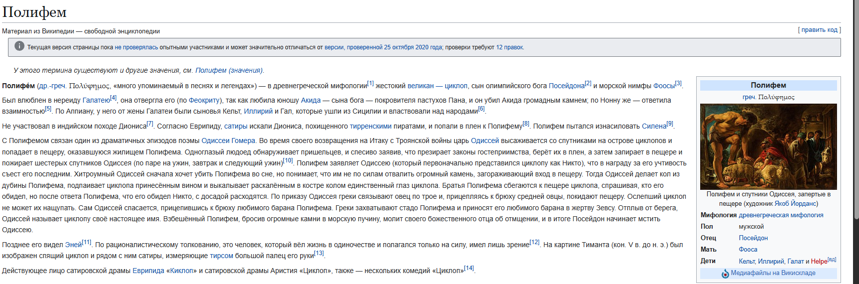 >>9993934 >в греции рили существовали такие монстры? чет не читал про таких в исторических книгах Мифы и легенды древней греции так то. Полифем был циклопом которого ослепил Одиссей, а за это Посейдон подразъебал ЕКСПЕДИЦИЮ одиссея. Полифем был его сынком.