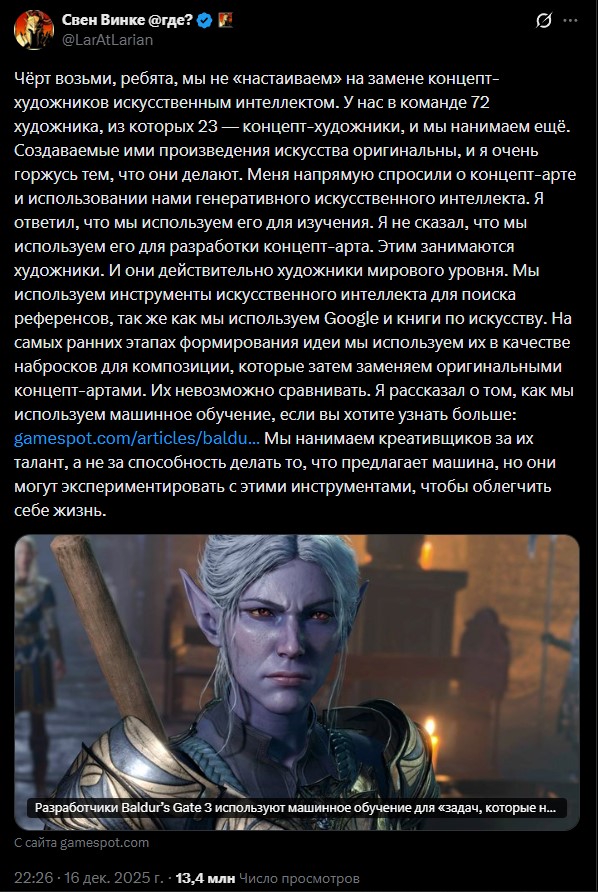 Свен Винке высказался на тему того что АИ в играх это классно. За это его проткнули всем игровым сообществом и накидали негативных обзоров его играм. На что жопа Свена улетела в космос (не привык к критике) и начал пост со слов "Holy fuck guys..." оправдываясь и давая заднюю. Даже досталось Экспедиции 33 за то что листки газет приклеенные к жестянке были написаны аи. СКАЖЕМ НЕТ НЕЙРО СЛОПУ В ИГРАХ!