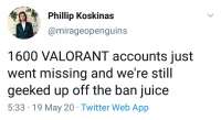 Смесь CS и OVERWATCH на Unreal Engine 4.>Оф.сайт https://beta.playvalorant.com/ru-ru/>Reddit https://www.reddit.com/r/VALORANT/Ключи раздаются за просмотр трансляций Valorant на твитче, трансляция должна иметь таг drops enabled, к твитчу должен быть привязан ваш аккаунт Riot Games.После ЗБТ будет вайп, вернут RP (донатная валюта) + 20%Для пользователей из России голосовой чат был отключен из-за закона Яровой.прошлый: https://2ch.hk/vg/res/33808657.html