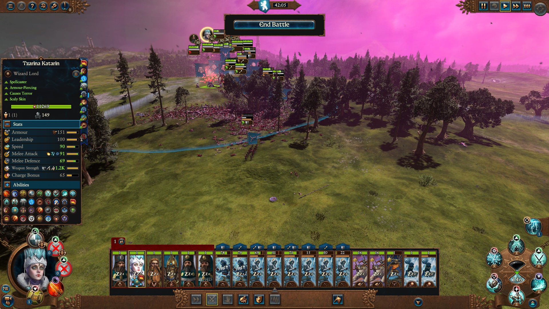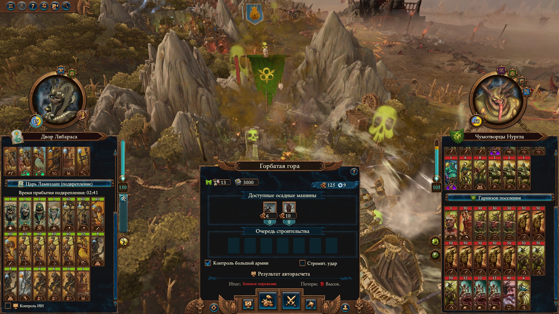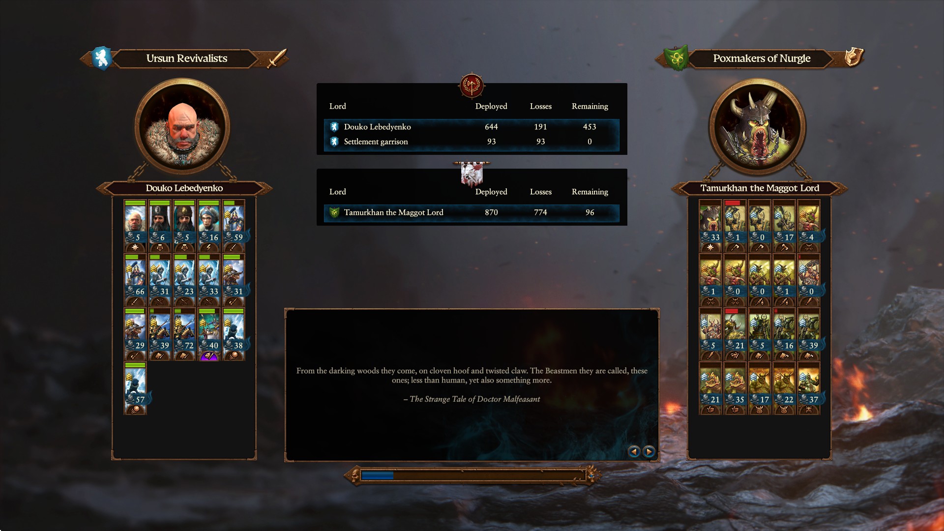 >>49816926 → У меня самого жопа чуть не сгорела от его смерти. Я уже думал, что все, хана, по-новой мага качать. А бой был такой геморный, что переигрывать вообще ноль желания, можно ещё и проиграть нахуй в итоге, потому что все на соплях держалось. Три армии орков с Вурзагом навалились, какой-то герой в хаотичном зарубе прорвался в мой тыл и вальнул мага... тварь. Но по счастью лич присты получают бессмертие гораздо раньше обычного. Так что пронесло.