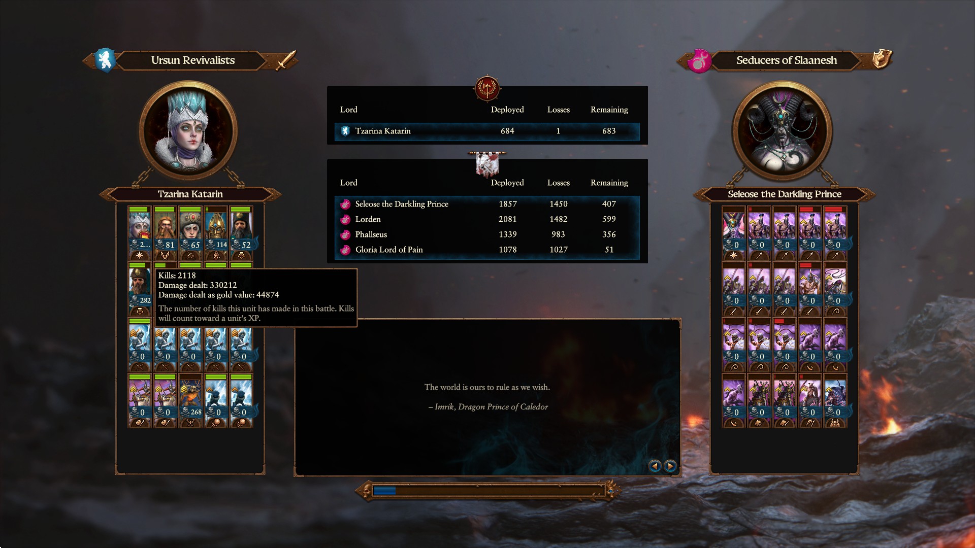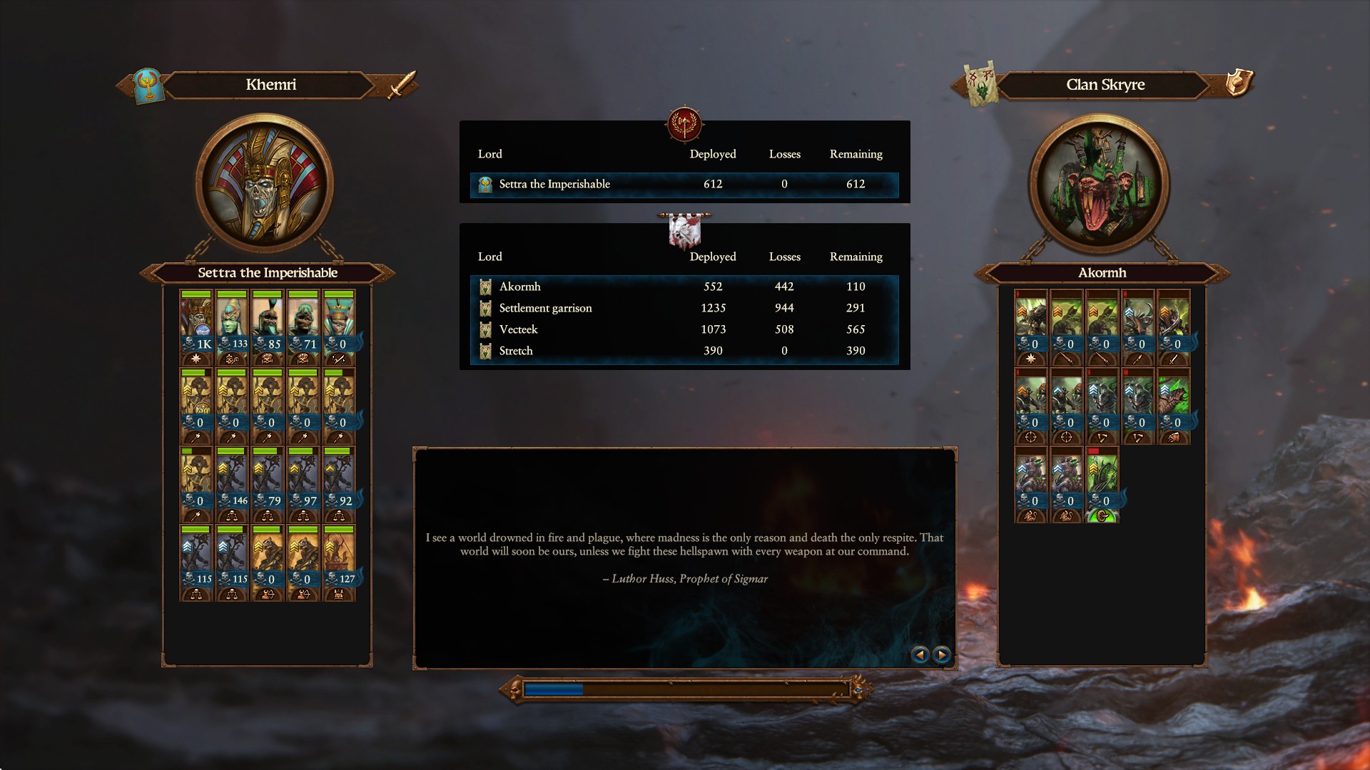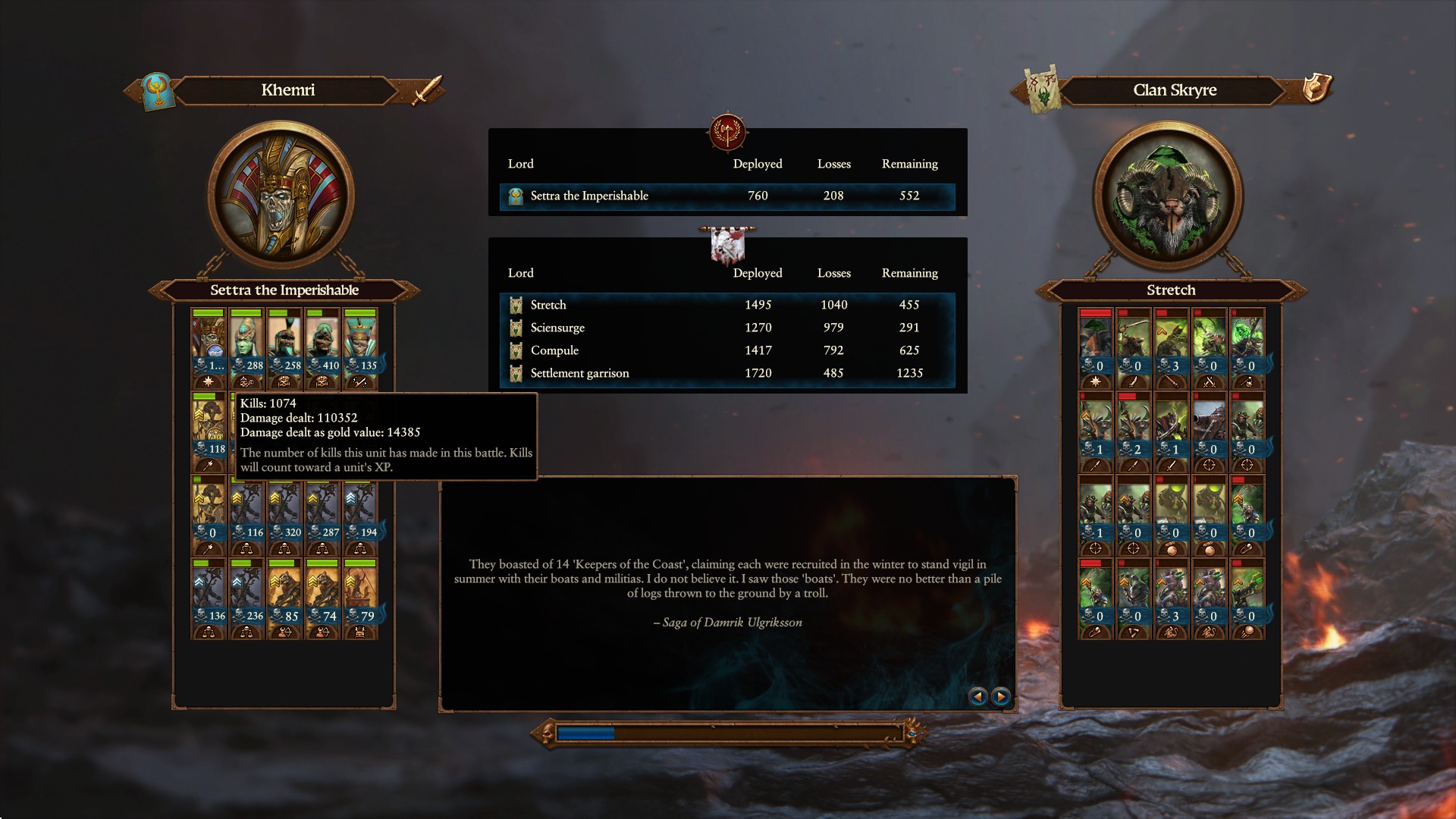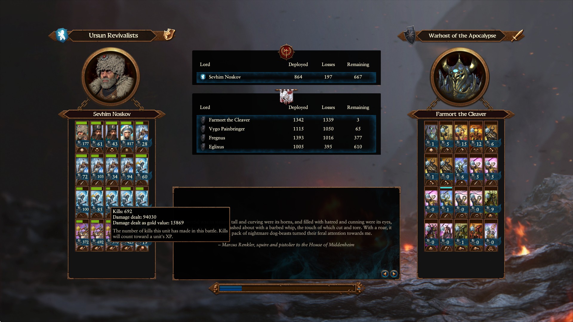 >>49816926 → У меня самого жопа чуть не сгорела от его смерти. Я уже думал, что все, хана, по-новой мага качать. А бой был такой геморный, что переигрывать вообще ноль желания, можно ещё и проиграть нахуй в итоге, потому что все на соплях держалось. Три армии орков с Вурзагом навалились, какой-то герой в хаотичном зарубе прорвался в мой тыл и вальнул мага... тварь. Но по счастью лич присты получают бессмертие гораздо раньше обычного. Так что пронесло.