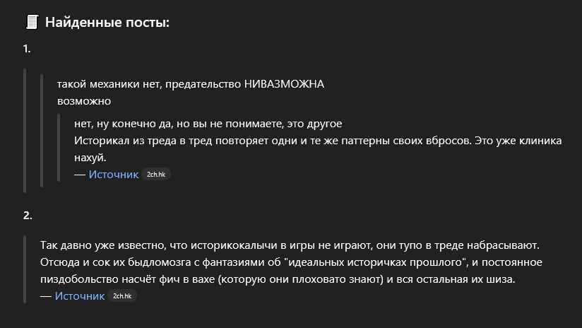 >>49841106 Нейронка так устроена что слишком сильно обсирать никого не будет, особенно при сравнении. Особенно если вопрос о вкусах, а не чисто больше-меньше. Даже если отдельно образ историкалыча рисует полным ебанатом и лжецом (и прямым текстом это пишет, не от себя добавляю), в подобном сравнительном посте в итоге напишет что всё пиздец неоднозначно и сам короче думай кто прав. При этом для сравнения оно берет посты из тредов (указал ещё и с реддита для большего охвата, но по итогу нихуя не изменилось), поэтому реальная ваха борется с мифической несуществующей великой историчкой + выдуманными фейк механиками и недостатками вахи. В таких условиях борьба уже реально становится тяжелой.