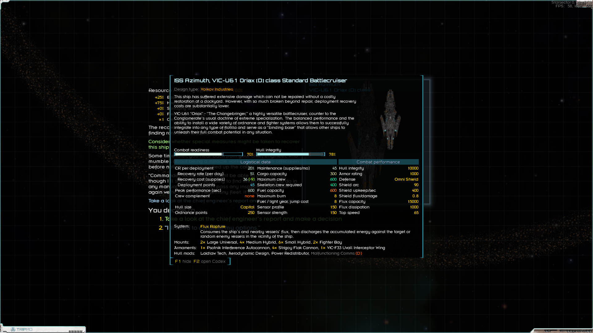 Старсектор ньюфаг репортинг ин. Это блдядь не игра, а ловушка джокера. Я из ангара не выхожу, всё тестирую разные сборки. И мне это нравится! Нашёл вот такой гиперион поломанный. И не починить. Ну вот хули с ним делать с его пиковой работой. Крутил его вертел, думаю - хуй с ним, есть офицер по энергооружию, пускай развлекается. Ресурсы только будет жрать... но, вроде, не бедствуем. Основал колонию на планете 5го класса, с нормальной жратвой. А рядом - 3 спутника со всеми возможными ресурсами. Будем развивать. Игра - бомба.