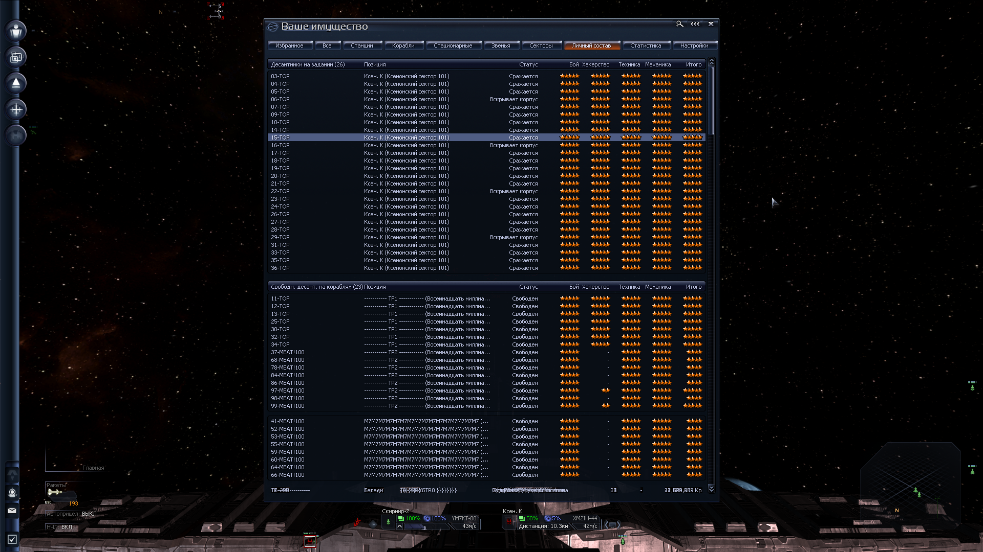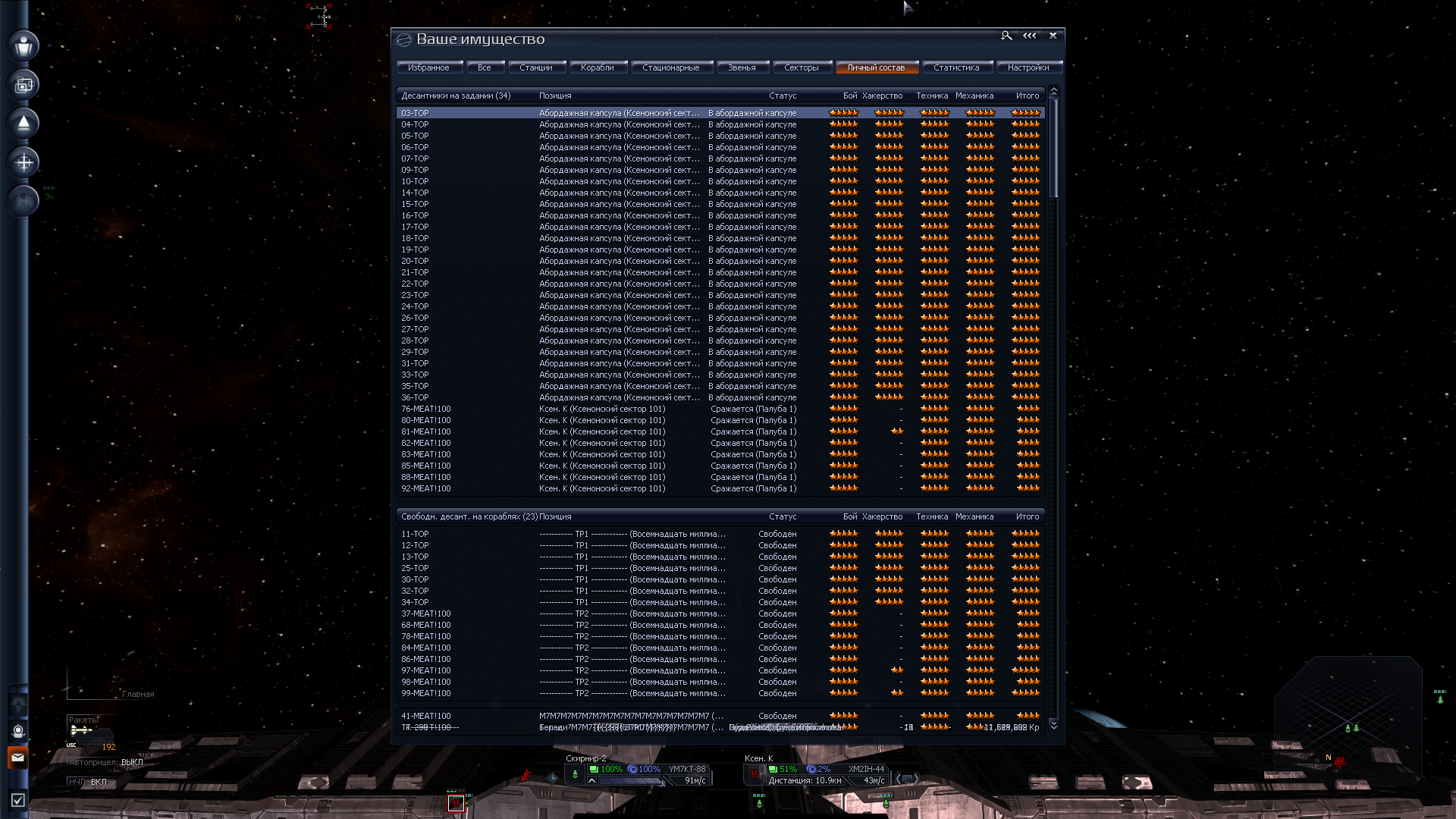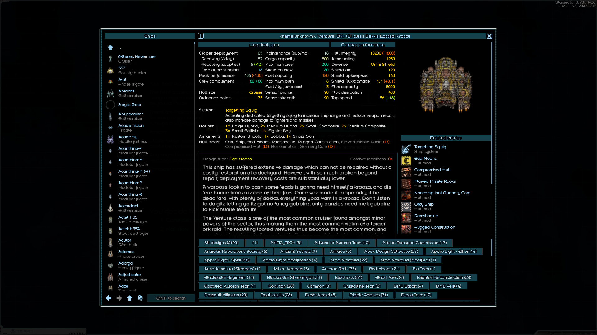 Но! На это нужен трюм, желательно экранированный. А его нет. И нужны деньги, а их нет. Хотел было слетать на разведку по заданиям, но оказалось, что мой "эксплораторный флот" далеко не летает. И на каком-нибудь говноцербере я бы изи долетел туда-обратно. А тут нет. Загрустив я нашёл пару наград за головы неподалёку. Хотя до этого неподалёка я долетал в один конец, лол. Ну хуле делать - полетел, дал пизды. У врага была куча фрегатов, я уж было совсем загрустил, но оказалось, что осы под баффом оные фрегаты щёлкуют как орешки. Рядом оказалась заброшенная модостанция, с которой меня погнали ссаными тряпками бомжи, а вот на обратном пути я нашёл сначала этот линкор, практически нулёвый, затем ссыкуна-офицера в разбитом грузовике, а затем и орочий крейсер в туманности. И благодаря луту на последней понюшке дотянул обратно. А ещё я заметил, что игра мне нарандомила два одинаковых названия на стартовые корабли. Козырненько, RNGesus мне явно благоволит. По этому смена планов - с этой награды одеваем "крузир" и летим ломать кабины бомжам за награду. На эти деньги одеваем линкор у ВИКов в родное. Для стиля и теста. И на нём выполняю уже серьёзные награды. А офицера перетренирую. Благо я вспомнил как раз, что хотел установить мод, который позволяет довольно сбалансировано сбрасывать уровень офицерам. Именно уровень, т.е. экспу придётся набирать заново. И с таким стартовым скиллом этот хер - задел на корабль без щита. Если бы играл без мода, я бы сказал, что на фазовый и плохая, но с этим модом я его до 1го лвл сброшу а дальше эндуранс, импакт и мб манёвренность. Остальное добью дамагом.