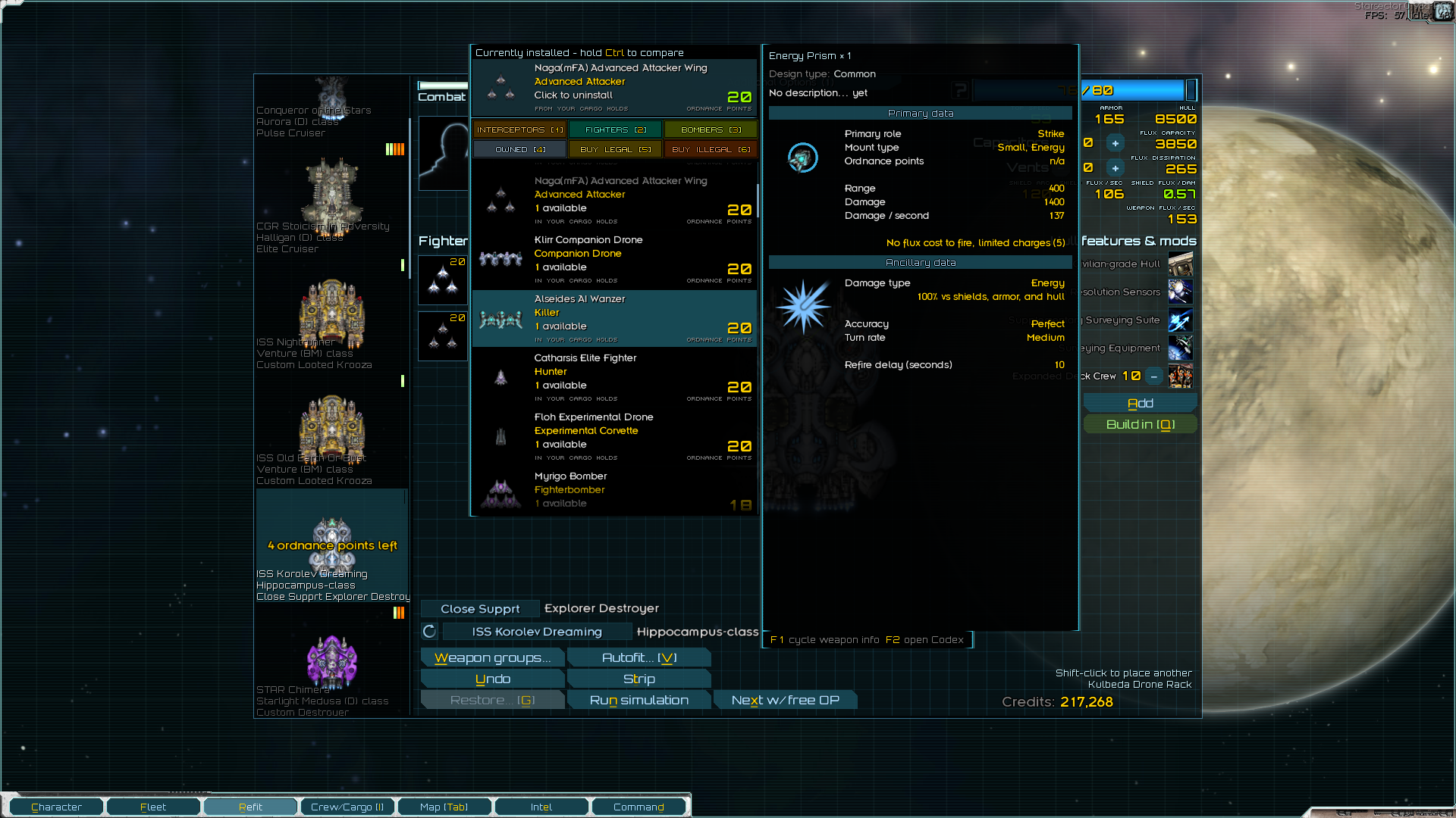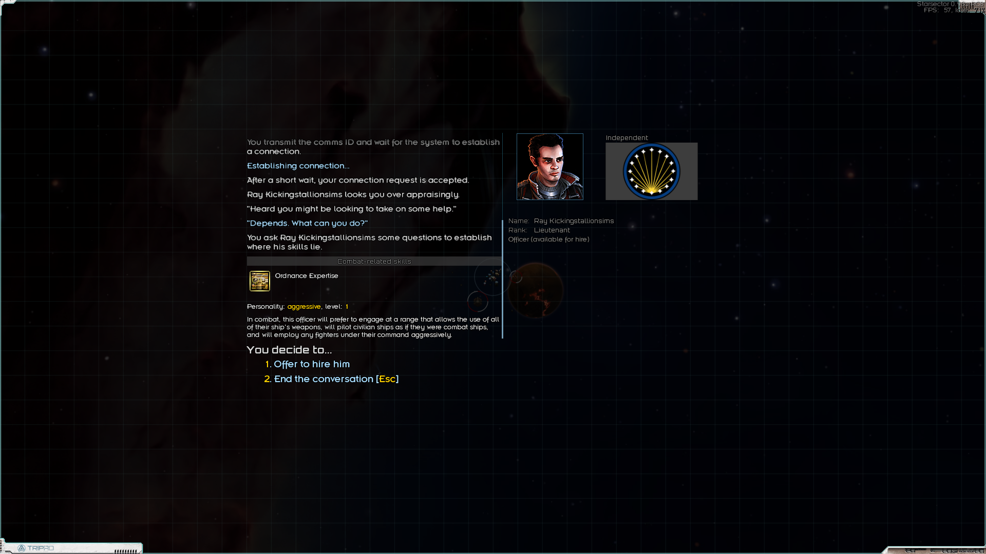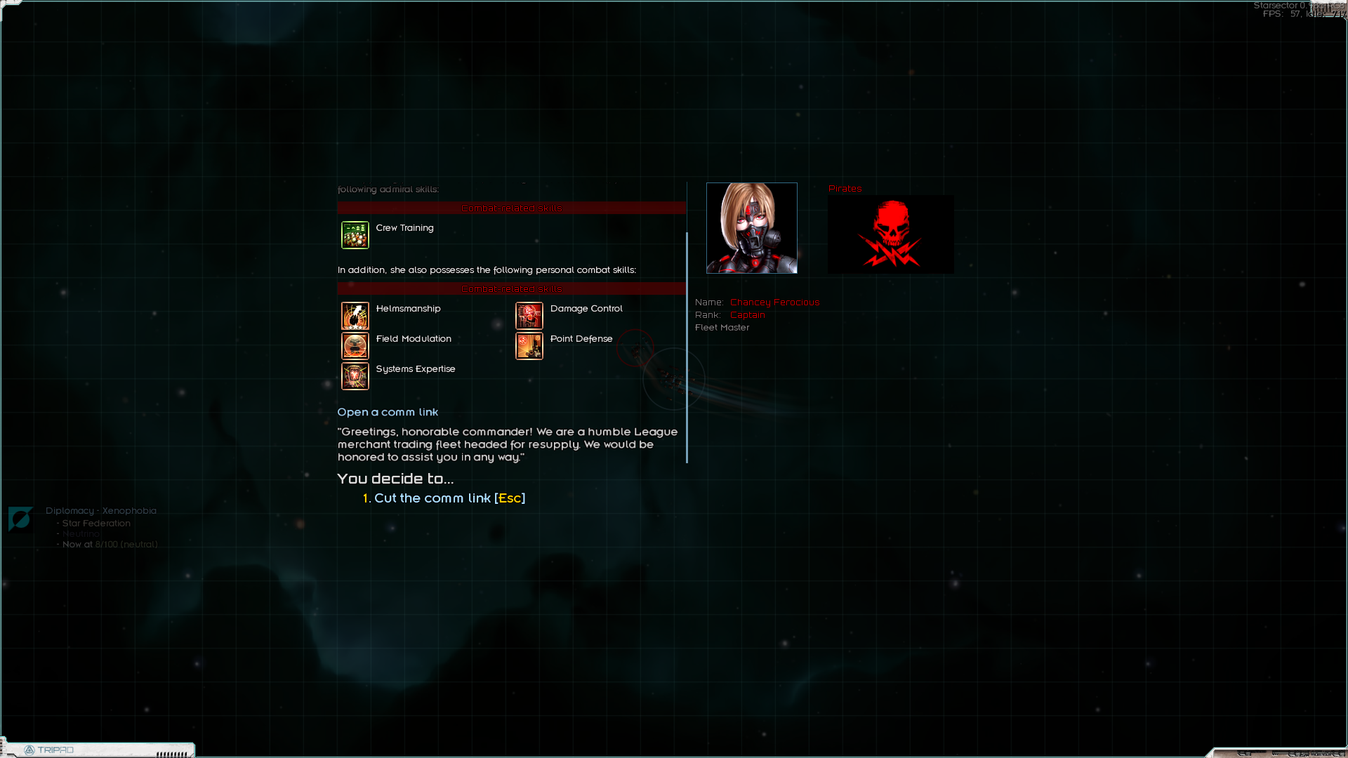 Но! На это нужен трюм, желательно экранированный. А его нет. И нужны деньги, а их нет. Хотел было слетать на разведку по заданиям, но оказалось, что мой "эксплораторный флот" далеко не летает. И на каком-нибудь говноцербере я бы изи долетел туда-обратно. А тут нет. Загрустив я нашёл пару наград за головы неподалёку. Хотя до этого неподалёка я долетал в один конец, лол. Ну хуле делать - полетел, дал пизды. У врага была куча фрегатов, я уж было совсем загрустил, но оказалось, что осы под баффом оные фрегаты щёлкуют как орешки. Рядом оказалась заброшенная модостанция, с которой меня погнали ссаными тряпками бомжи, а вот на обратном пути я нашёл сначала этот линкор, практически нулёвый, затем ссыкуна-офицера в разбитом грузовике, а затем и орочий крейсер в туманности. И благодаря луту на последней понюшке дотянул обратно. А ещё я заметил, что игра мне нарандомила два одинаковых названия на стартовые корабли. Козырненько, RNGesus мне явно благоволит. По этому смена планов - с этой награды одеваем "крузир" и летим ломать кабины бомжам за награду. На эти деньги одеваем линкор у ВИКов в родное. Для стиля и теста. И на нём выполняю уже серьёзные награды. А офицера перетренирую. Благо я вспомнил как раз, что хотел установить мод, который позволяет довольно сбалансировано сбрасывать уровень офицерам. Именно уровень, т.е. экспу придётся набирать заново. И с таким стартовым скиллом этот хер - задел на корабль без щита. Если бы играл без мода, я бы сказал, что на фазовый и плохая, но с этим модом я его до 1го лвл сброшу а дальше эндуранс, импакт и мб манёвренность. Остальное добью дамагом.