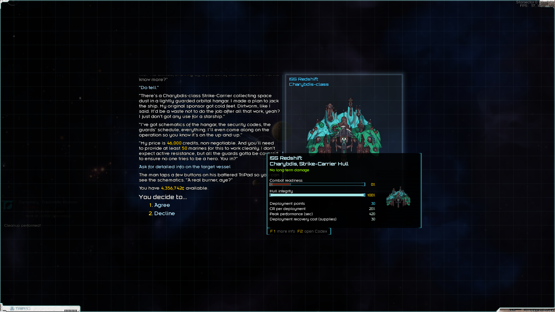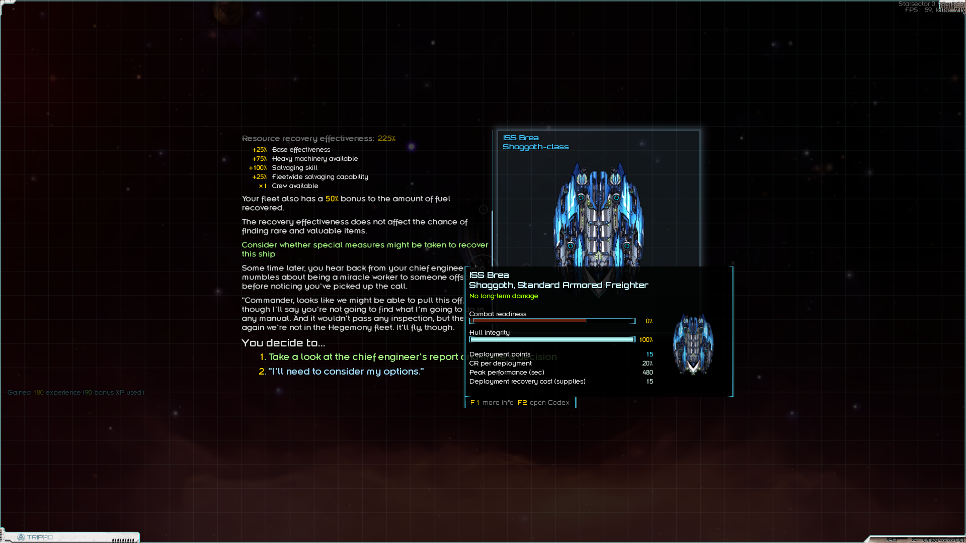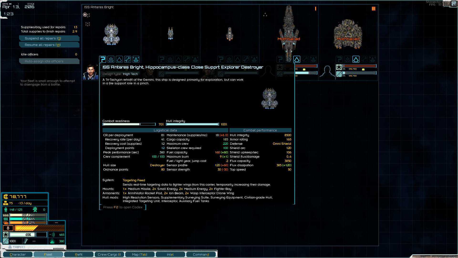 Поломная миссия кстати, я поначалу думал, что васянка, а оказалась ванилька. За чуть-чуть денег и солдат (которые ещё и не потратились) я получил нулёвый корабль за 20-25% его стоимости. Правда денег одеть его не было, посему он пока подрабатывает логистическим мулом. Теперь нужно его одеть и добыть нормальные грузовик и заправщик. Плюс 30-50к на одёжу линкору. И можно выполнять боевые контракты на 150к.