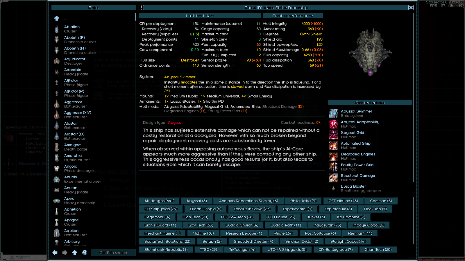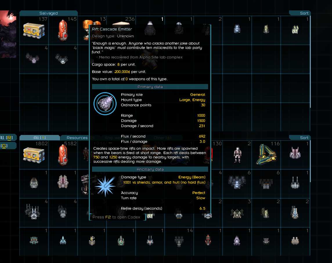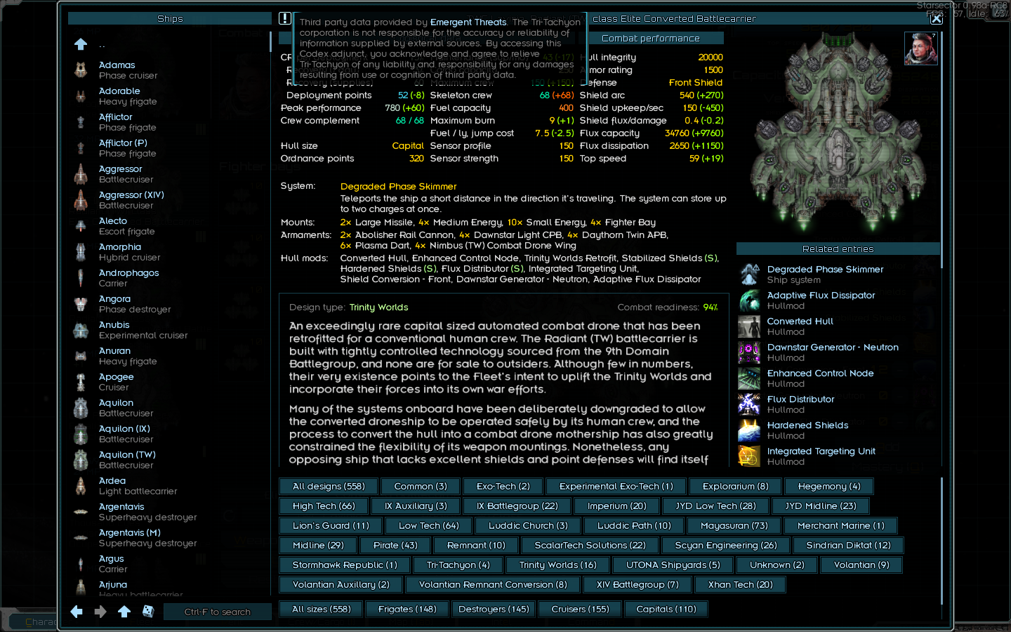 И кстати о васянобалансе - Кадырки Кадурки: Практически все корабли - парашное говно. Что я повторно обнаружил (уже давно успел забыть) когда тестя свой лутвагон ради интереса не выбрал вместо Доминатора Голема. У последнего цена больше, а всех статов меньше раза в два. И жрёт это говно куда больше топлива. И если Доминатор для моей кастомной венчуры - это стресс тест и он её чаще всего пиздит (ИИ против ИИ), что не удивительно, учитывая разницу в ДП, то Голема моя коробочка взъебала не сильно напрягаясь, ибо у того всё настолько херово со щитами и флаксом (в ДВА раза меньше флакса чему Доминатора), что ему хардфлакс набился банально более слабыми, но похожими на аннигиляторы ракетами за 3 залпа, благо они наводятся и я ими напердел до рейнджа баллистики. И даже вообще без ракет Голем получает по жопе. Если не забуду и переборю лень - ручками пофикшу это говно, чтобы хотя бы на уровне лоутека бабахи воевали. Они и так обососы. Хотя пушки и файтеры у них интересные, этого не отнять.
