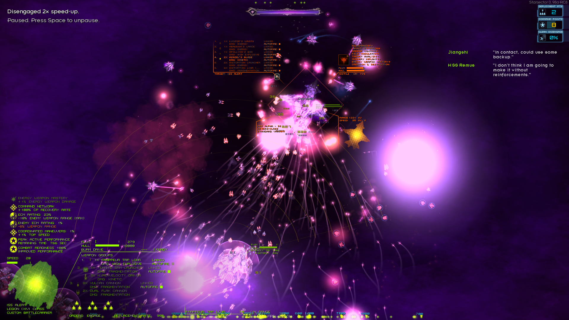 >>49814644 Ну вот, теперь будешь играть правильно. >>49817215 >но ещё быстрее лопается мой керриер когда с какого-то перепугу решает потанчить еблом на первой линии. Это решается ссыкливым офицером + гражданским маяком на карте в жопе своего флота. Гражданский потому, что в отличии от обычного корабли привязанные к ниму никуда не шароёбятся. >>49818212 Так не давай его фланговать. Отправляй на фланги своих набегателей или просто прикажи сопровождать атлас пригоршне фрегатов или дестроеру. >>49818357 Возможно и на обычную можно запилить, но учитывая что он добавляет кучу разной хуеты - сомневаюсь. Но ты попробуй, только бэкап не забудь сделать. >>49818418 >Но если принять во внимание, что для фракции LI генерируется отдельная система, наверняка второе. Это не показатель. Я вот например тиандонг специально уже на созданный сейв добавил, чтобы планеты не генерировались, ибо там какая-то манямеханика на какой-то их планете игру ломает. И оружие с файтерами с них в магазинах появляются. Правда корабелей пока не видел (они добавляют нейтралам всяким часть своих). Но я и кроме как с пейратами почти ни с кем и не дрался пока.