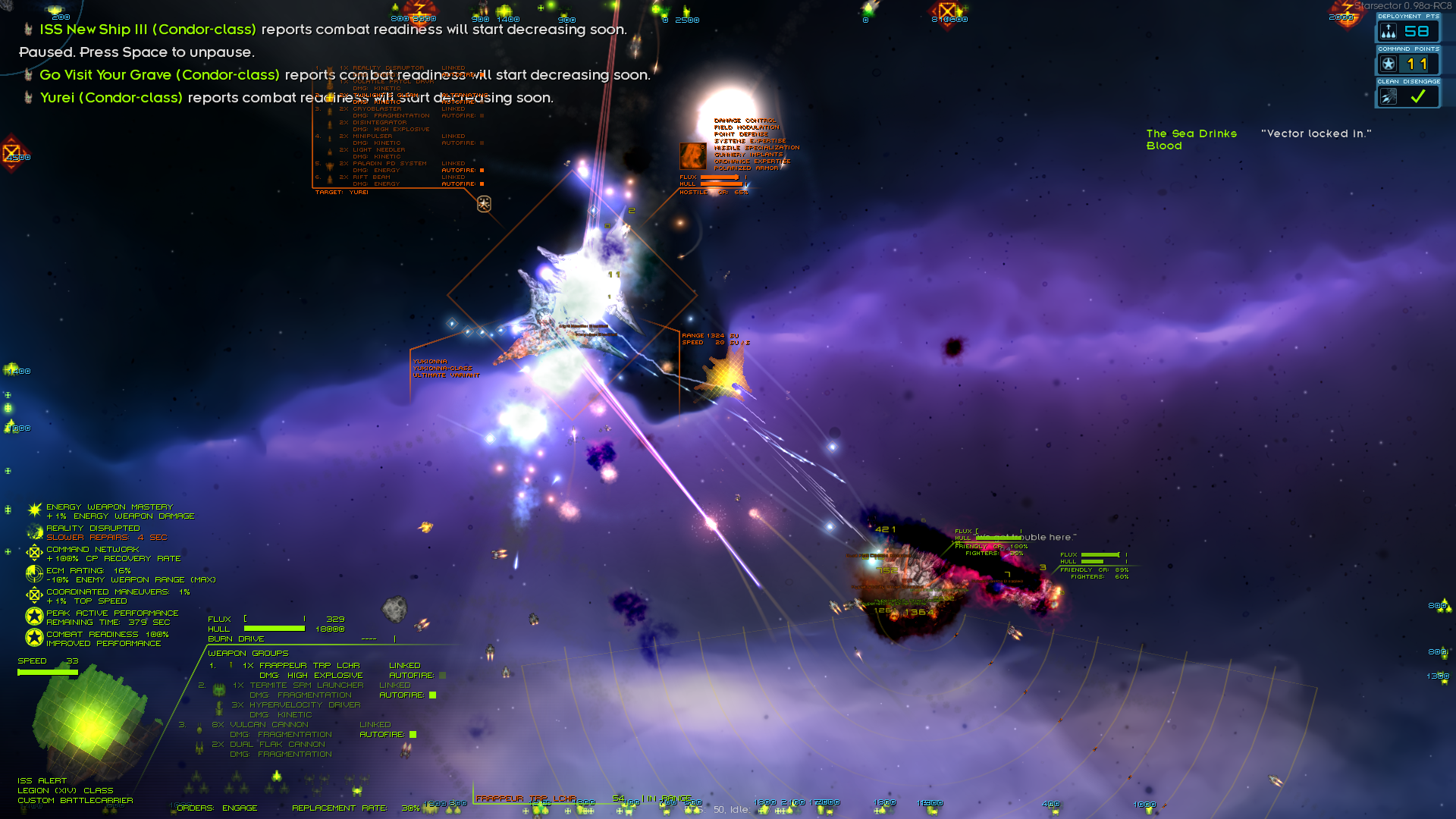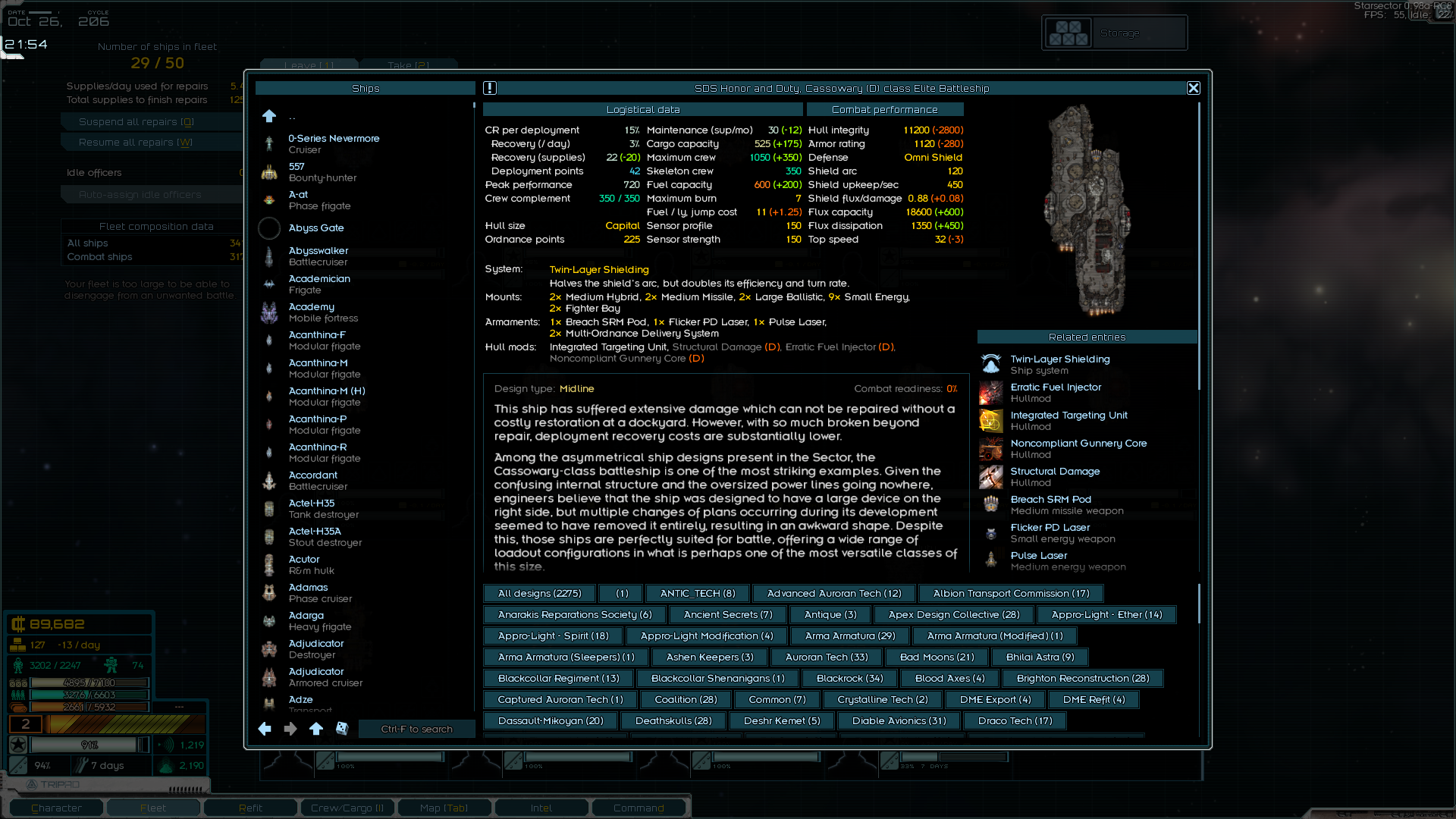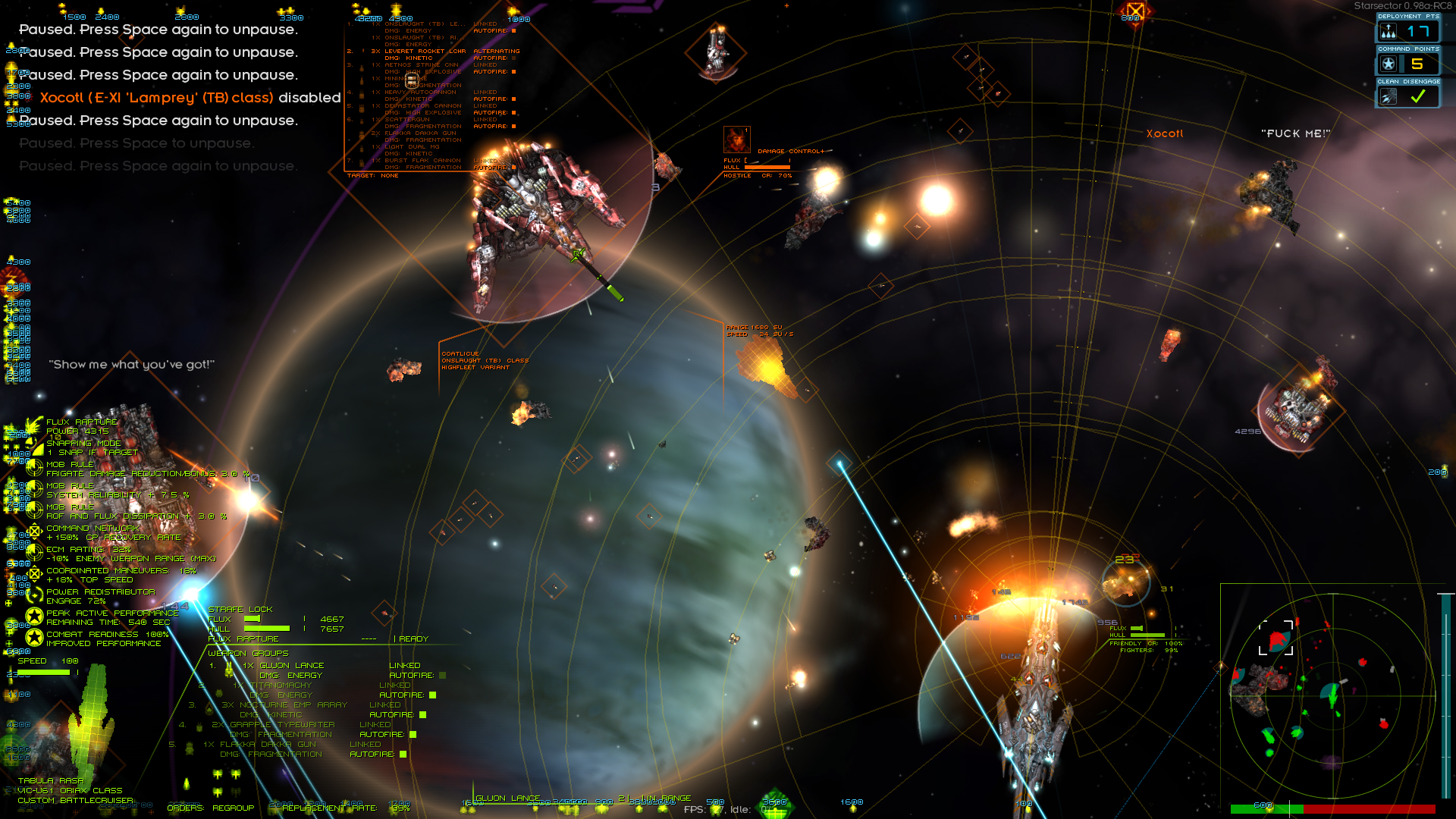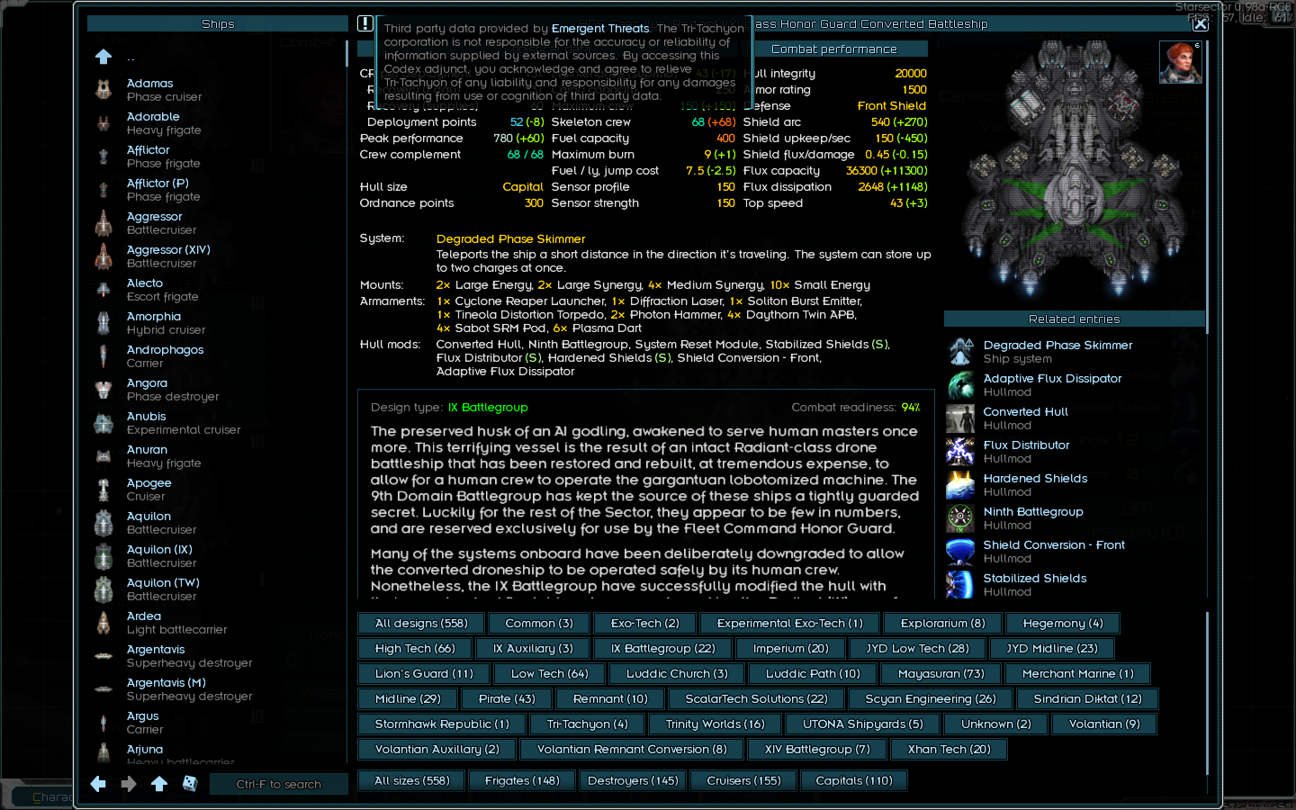 Кстати о них - пиздец у них раза в 3 больше зоопарк с модов моих. Чего только нет, от фазовых крейсеров и маняхайтека (который правда на ходу разваливается) до орочьих вагонов. Наконец ввёл в строй линкор, да ещё по дороге к корвусу за ним на меня прыгнул аж целый доминатор с подтанцовкой. И дропнулся всего с одним Д-модом. Оба хороши - линкор правда в прямом бою едва ли сильнее доминатора, но чудо какой шустрый - эсминцы догоняет. Система ебашит ЕМП, вроде пишет что снимая флакс с себя и созников, но что-то не заметил. Или урон скалируется от флакса? Разберусь потом. Тут же устроил стресс тест приобритениям - со всем этим мусором напал на пиратскую станцию, благо она мидлайн. У меня как раз контракт разбомбить пиратский мир. Хорошо получилось отманить главный флот с линкором и пол дюжиной крейсеров, он был бы проблемой если бы это не были пиратские линкор и крейсера с 4-6 Д-модами каждый. А так - взял в охапку фрегаты и с ним обошёл пирата с фланга, пока тот бился о венчуру и доминатор. Потом поднакопил КР и ёбнул крепость. Даже учитывая, что это сраный мидлайн - было непросто. Хотя и потерял всего пару фрегатов, которых тут же вернул. Обычно я их не беру на станции, но там было куча недобитой мелочёвки и её нужно было занять, чтобы в жопу риперов не накидали и два говноавианосца не сломали. Потерял бы больше, если бы не догадался пересесть с линкора на доминатор - ии-долбоёб частенько насасывает на нём в глубоком тыло, даром что все офицеры у меня агрессивные. А тут встал по вращению станции и когда она проворачивалась до меня - остальные ей уже успевали напрячь щиты, а я ебашил в упор из всего корпус. В сухом остатке - куча денег, куча лута, вторая орочья венчура и гамма-ИИ, который я с пиратов слутал. Теперь, с 3 крейсерами (2 так себе, но всё же) и каким-никаким, но линкором можно брать заказы на станции.