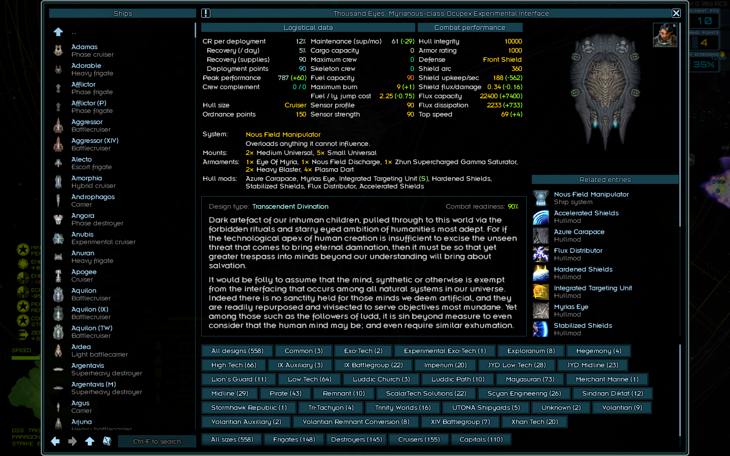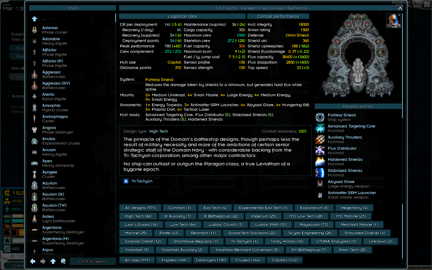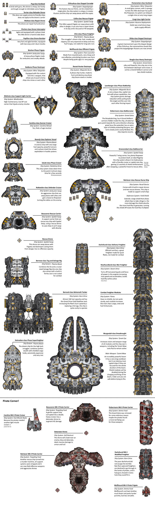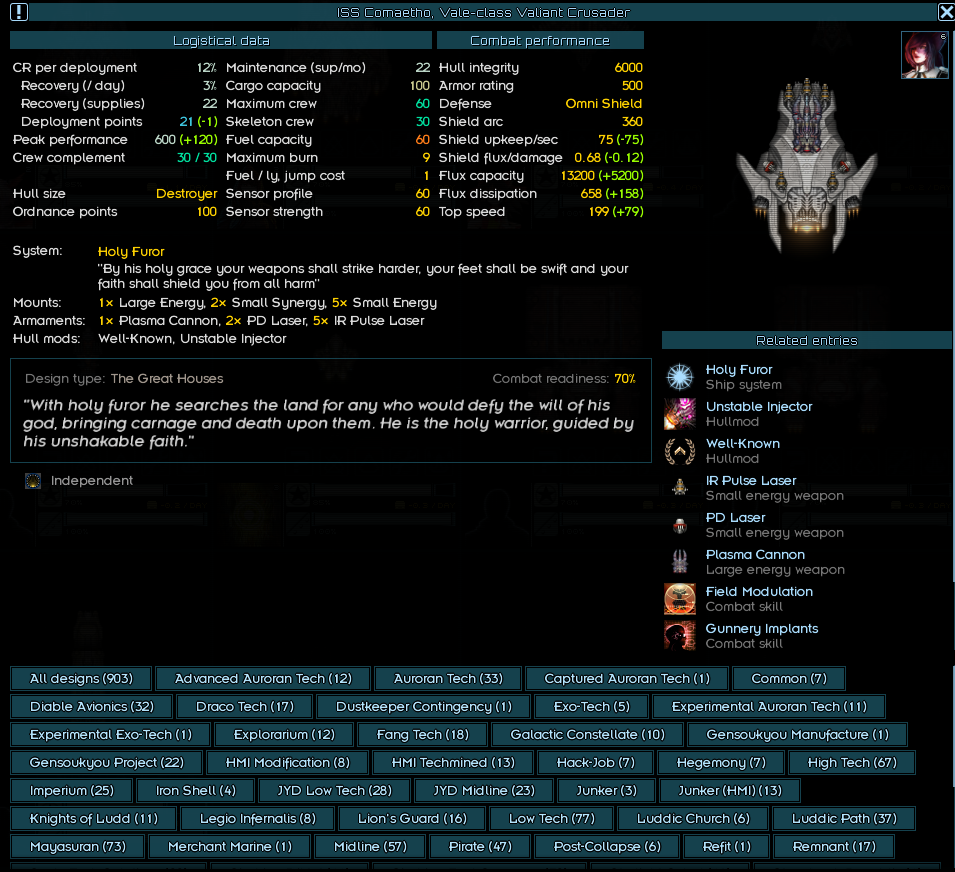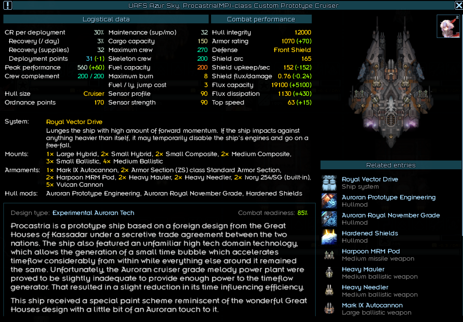 Рековернул некоторые кораблики из пограничных флотов, скрины. Синергия в том, что у Крузеров поверх очень приличных щитов и флюкса на уровне хайтека есть читерная система на х2 таймфлоу (а это в первую очередь х2 флакс и скорость атаки) и баф на урон ещё поверх, у мелких кораблей тоже хуйня с таймфлоу. А у Капиталки (вдобавок к тому что он в одиночку так-то ни разу не кусок говна) есть своя система которая ускоряет речардж систем у союзников + ЕЩЁ СВЕРХУ им отваливает бафов.